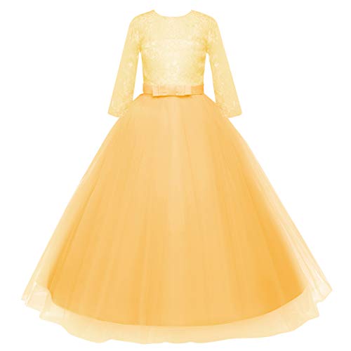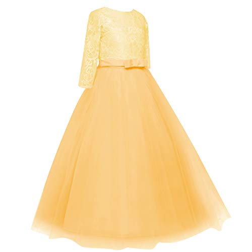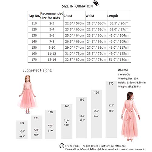 - ★★ Size: Flower girls lace long maxi dress available for 5-12 Years child girl. Please refer to our size information in the below product description or the left picture for Detail Size Chart before ordering. Junior bridesmaid dresses for girls. Tulle lace layered dress with delicate flower and bow make your sweet princess to be the most graceful and shining girl in the crowd. Beautiful design features a chic style for your young baby and make your little fairy look so distinctive.