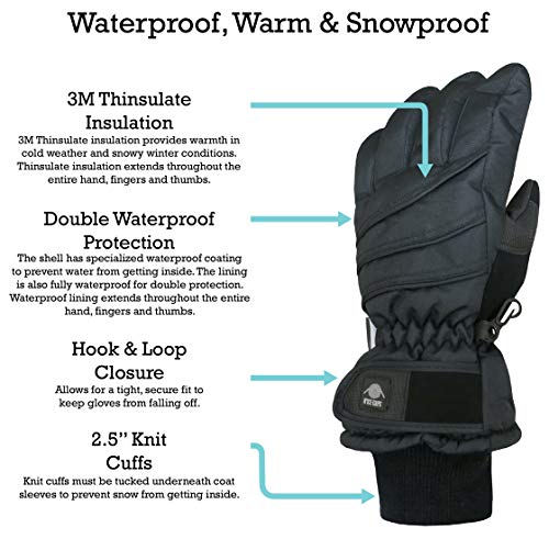 - WATERPROOF, WARM AND SNOWPROOF: The gloves are insulated with 3M Thinsulate for warmth in cold winter temperatures. The gloves are fully waterproof and will keep kids hands dry in wet, snowy and icy conditions. The gloves also have 2.5 inch knitted cuff that can be tucked underneath your kid's jacket and coat sleeves to prevent snow from getting inside the gloves.