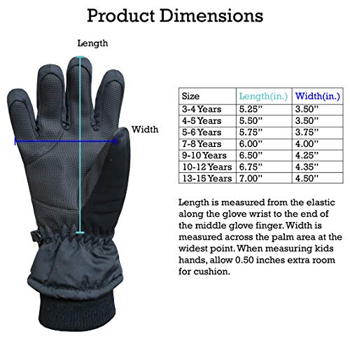 Details: N'Ice Caps Kids Cold Weather Waterproof Winter Gloves in Classic Colors for Boys and Girls. Gloves have 3M Thinsulate insulation and waterproof lining, great for cold temperatures and staying dry in wet or snowy conditions. Full PU sure gripper on palms, fingers and thumbs, and nubuck reinforced thumbs to provide grip for outdoors activities. Gloves have elastic under glove wrists for easy-on wear, and knit cuffs. Size recommendations and product dimensions (Dimensions: Length is measured from the elastic along the wrist of the glove to the end of the middle glove finger; Width is measured across the palm area of the glove at the widest point) : 3-4 Years (5.25" length, 3.5" width); 4-5 Years (5.5" length, 3.5" width); 5-6 Years (5.75" length, 3.75" width); 6-8 Years (6.0" length, 4.0" width), 8-10 Years (6.5" length, 4.25" width), 10-12 Years (6.75" length, 4.35" width), 13-15 Years (7.0" length, 4.5" length). Available in variety of bright colors for boys and girls of all ages.