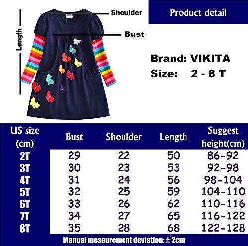 Details: VIKITA kids clothing is dirctly sell from VIKITA Factory. More kids clothes, please search VIKITA clothes or click into 'VIKITA Factory Store' front page. product description We focus to children health, using natural fabrics, the perfect combination of fashion and comfortable. All Trade Marks Belongs To VIKITA Style: Fashion & Cute Material: Cotton Notice: Our kids dresses are designed to allow room for growth, height is a better reference than age in choosing the correct size, if you want your kids wear longer time, please choose bigger. Size: 1T=6-18 months=80-85cm 2T=18-24 months=85-90cm 3T=2-3 years=90-95cm 4T=3-4 years=95-100cm 5T=4-5 years=105-110cm 6T=5-6 years=110-120cm