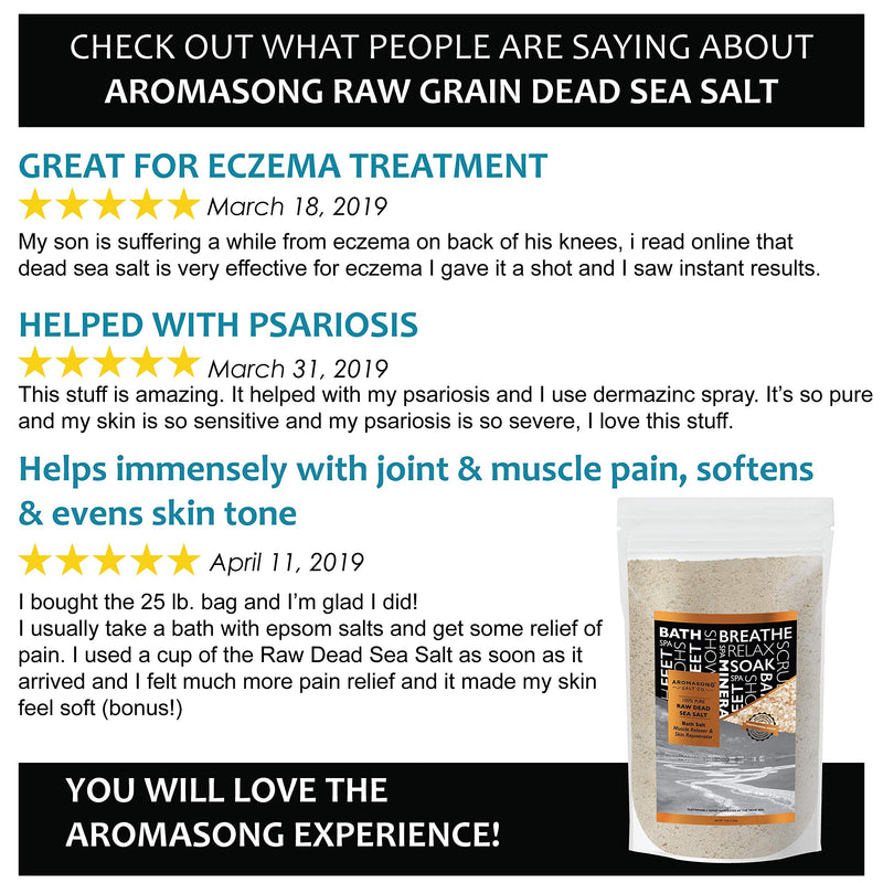 AROMASONG Raw Dead Sea Bath Salts products are 100% pure mineral salt, NOT CLEANED, still has DEAD SEA MUD in it THEREFORE YOU CAN FIND SOME BIG PIECES SALT OR SMALL ROCKS IN IT, Makes dry skin feel great and...