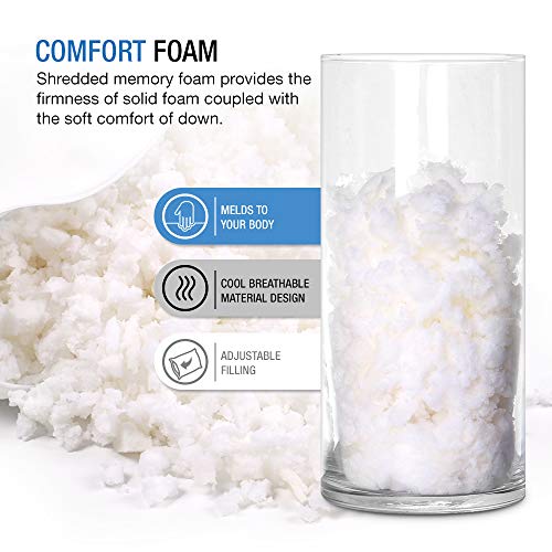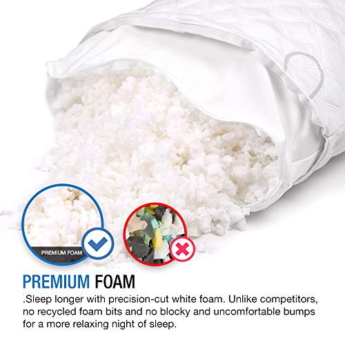 - [1-Pack Queen Size Pillow] Unmatched Support - Crafted with 80% shredded memory foam and 20% Polyester Fiber. This type of memory foam technology allows for a much more sensual and personal night of sleep. It gives users the ability to sleep for a prolonged period of time and not have to worry about aches and pains. The memory foam provides support for the neck, shoulders, back, and head.