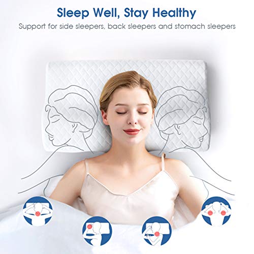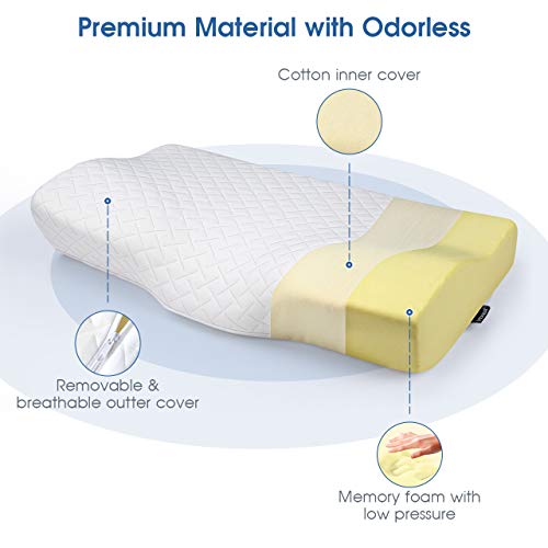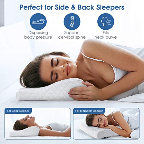 - [Relieve Your Neck Pains]: This cervical pillow uses high quality memory foam with increased isolated pressure distribution, helping you sleep through the night neck pain-free, and gently stretching and relieving your shoulder muscles, while supporting your neck. Also, this orthopedic pillow is designed with both high and low loft, promotes proper spinal alignment and helps release breathing airways to reduce snoring and relieves stiff pressure points along your neck, shoulder and back.