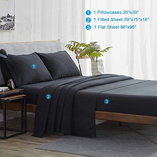 - 【WHAT YOU CAN GET】Twin Size Luxury 3pc Bed Sheets Set - 1 flat sheet 66" x 96", 1 fitted sheet 39"x75"x16",1 pillow cases 20" x 30".You don't have to worry about the size of your size.Deep pockets that fit mattresses up to 16" deep .These sheets grip and fit better than any other sheet set! It will never slide no matter how you twist and turn in your bed.