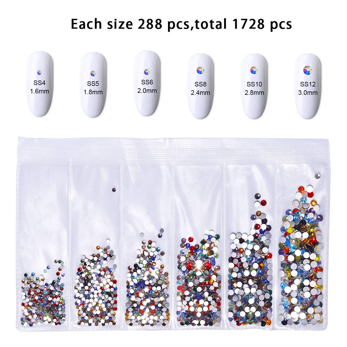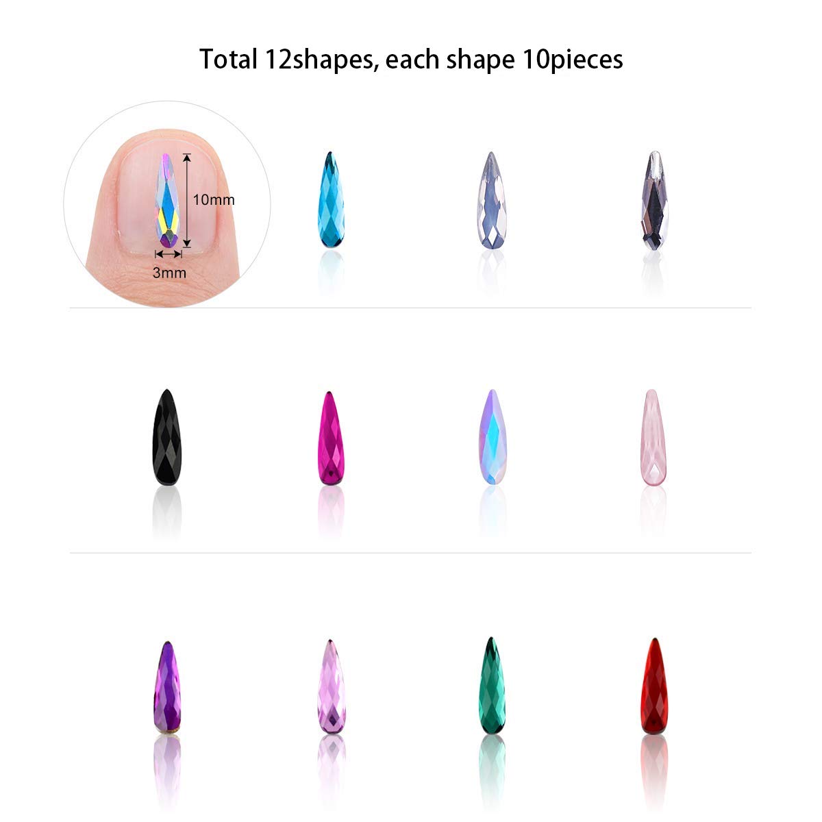 • 【Multicolor Rhinestones】This is a stylish and practical glass flatback rhinestone set include 120 pcs high quality glass decorations gems, 12 colors of water drop shape, each color 10pcs; 1728pcs multicolor rhinestones in 6 different sizes, make your nails more dazzling and charming.