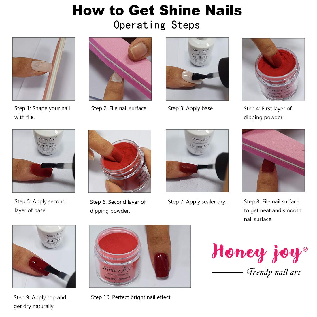 • Key Points: 1) Long Lasting under Correct Dip Nail Operation Steps; 2) Apply Dip Powder Evenly on Nails; 3) The Colors on Nail Tips Shown in Pictures were Made on False Nail Tips with 2 Coating / Layer of Dip Powder. And Colors on False Nail Tips Will Slightly Looks a Little Different From the Colors on Real Nails. 4) Easy to be Soaked Off By Nail Polish Remover Pad. If You Need Help When Making Your Dip Nails, Please Send us Inquiries for Help and E-Operation Steps can be Provided.