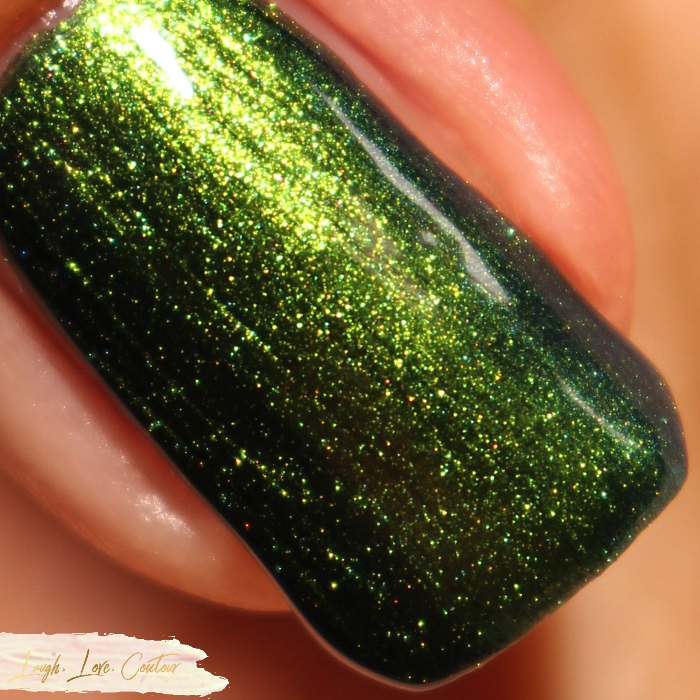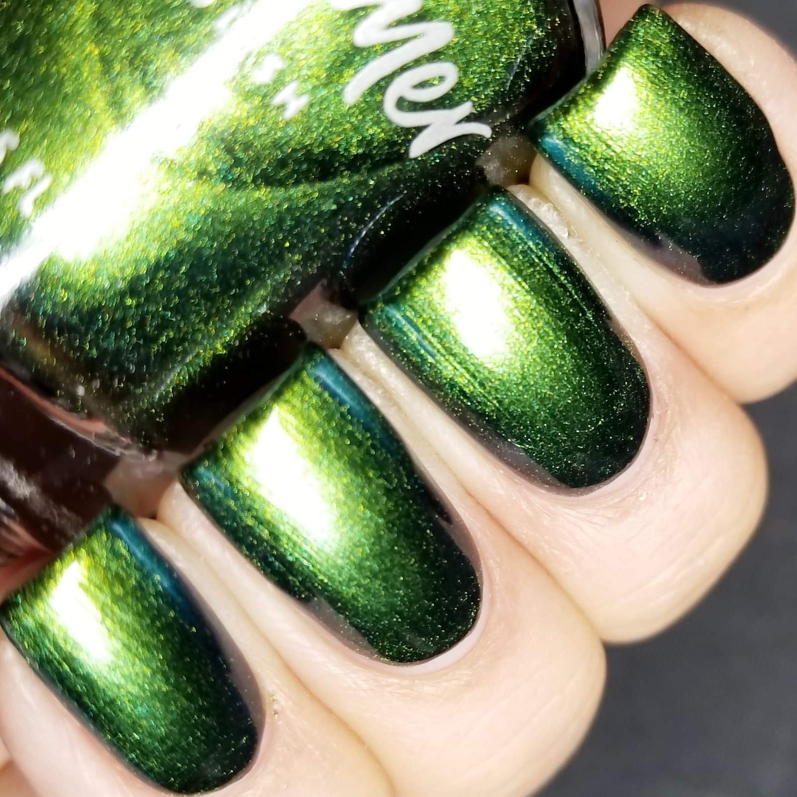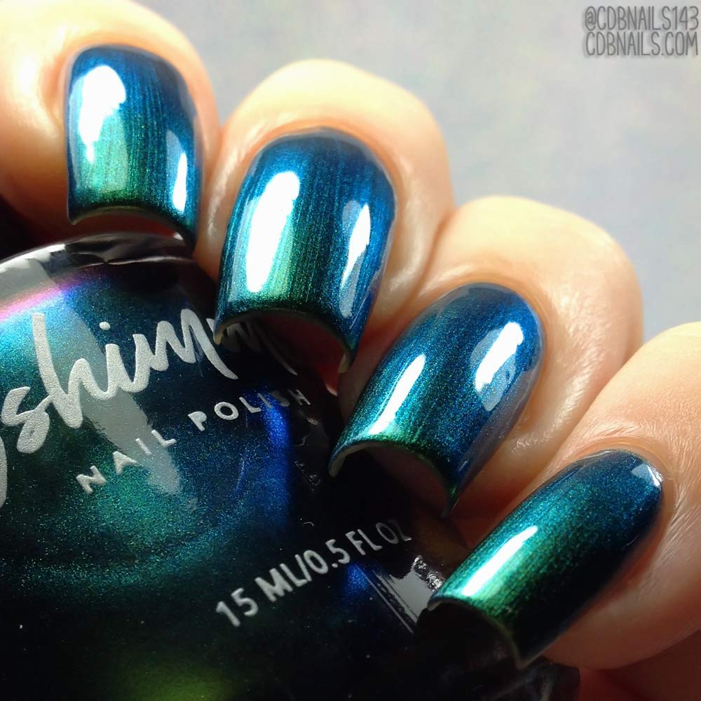 If there is one drink that I could see being a part of Halloween festivities, it is absinthe. This formerly banned drink is green in color, and in the past was said to cause hallucinations. Though not true, the bright shade of this drink inspired this polish. Absinthe Minded starts with a lime green hue, and quickly flows into grass green and blue. At extreme angles this polish can look navy. This polish is a steeped in mystery as absinthe itself! Type: Multi-Chrome Base: 5-Free Glitter Load: None Glitter Size: None Recommended Coats: Best in 2-3 coats, or 1 coat over black, this polish is one you will have to see to believe! Notes: None