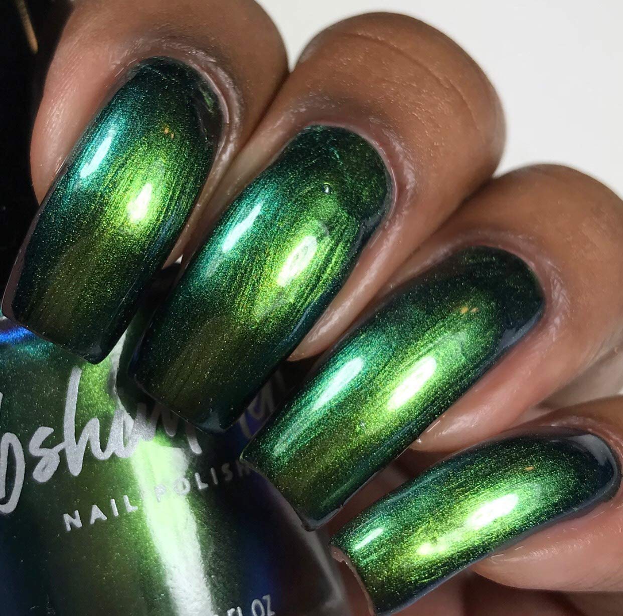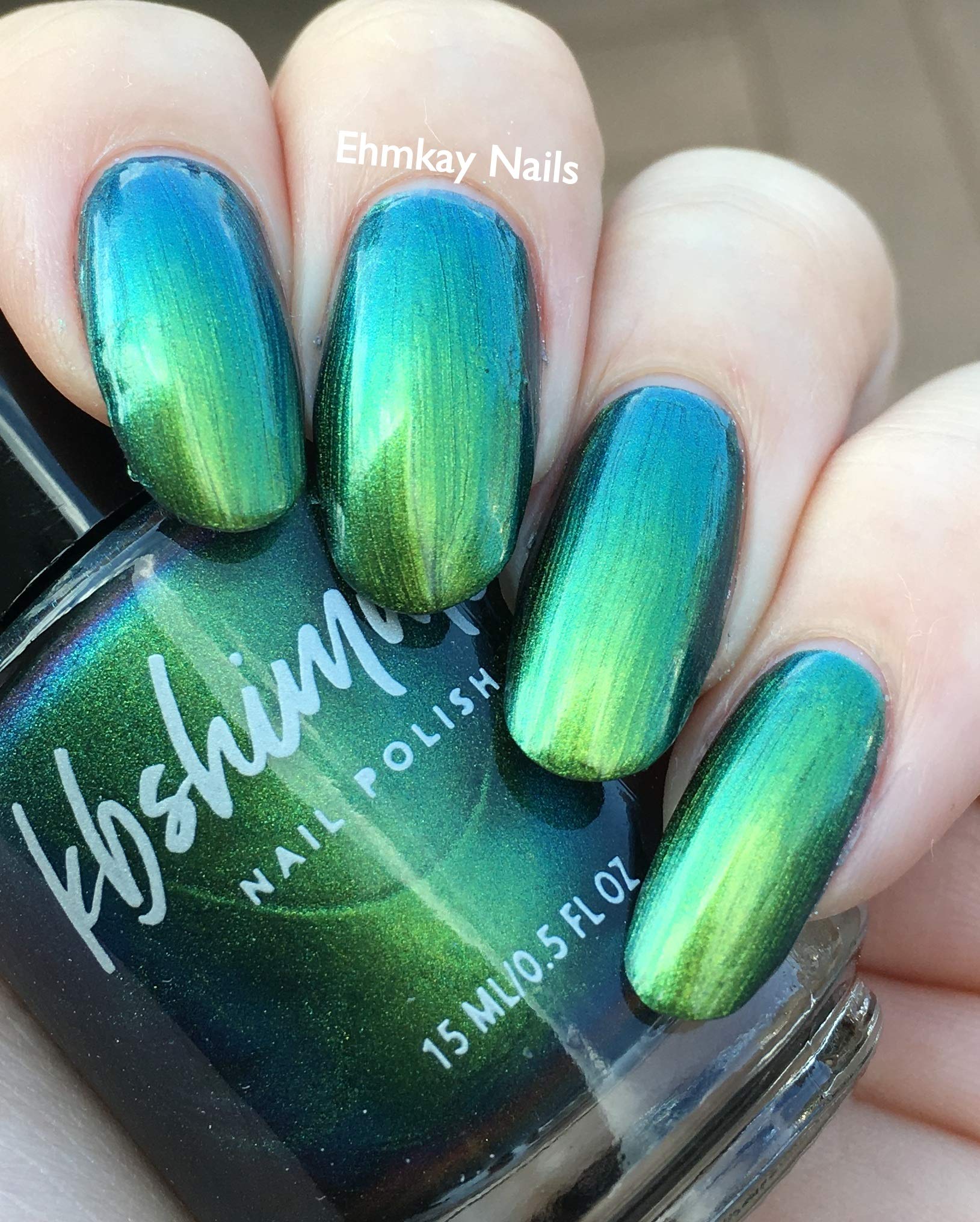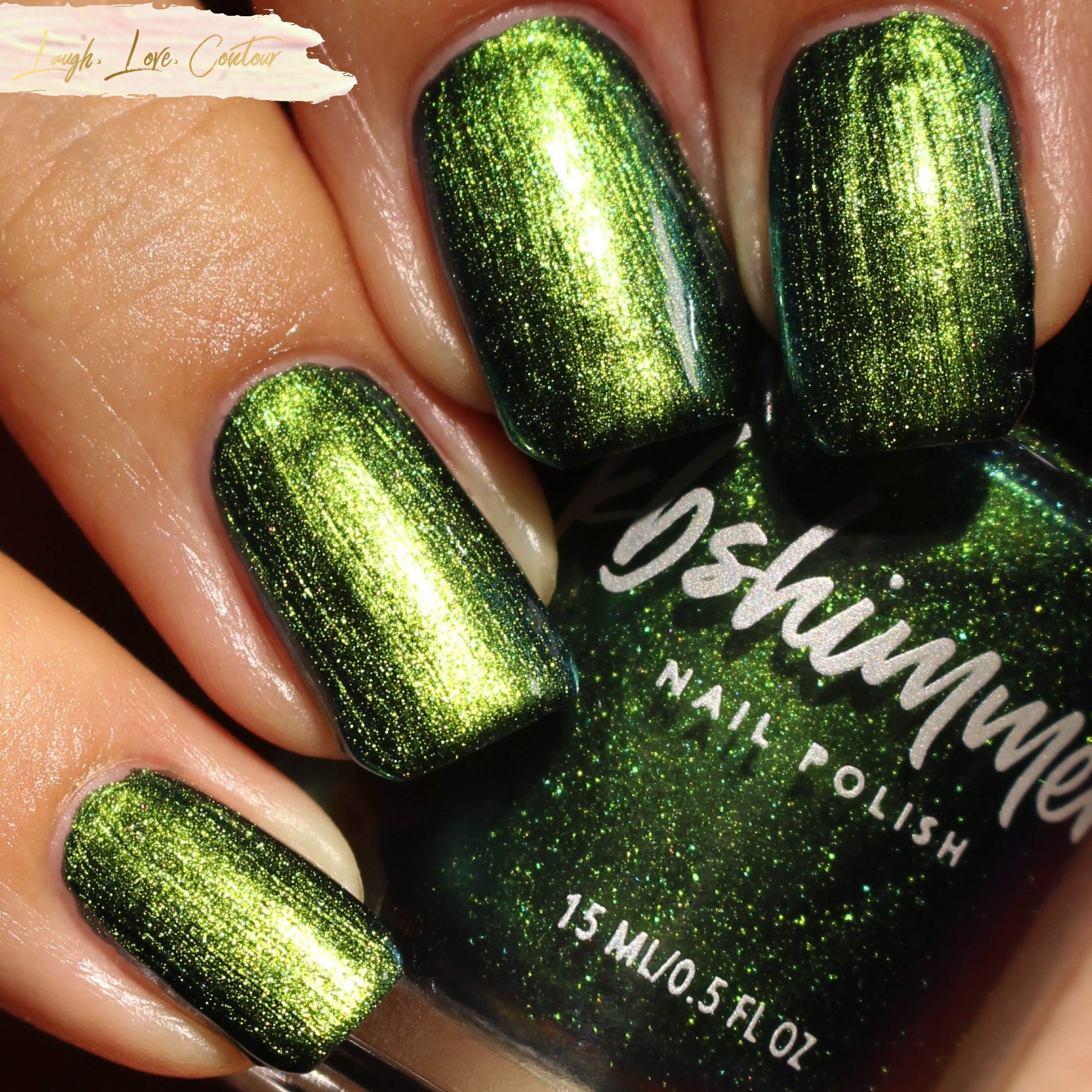 If there is one drink that I could see being a part of Halloween festivities, it is absinthe. This formerly banned drink is green in color, and in the past was said to cause hallucinations. Though not true, the bright shade of this drink inspired this polish. Absinthe Minded starts with a lime green hue, and quickly flows into grass green and blue. At extreme angles this polish can look navy. This polish is a steeped in mystery as absinthe itself! Type: Multi-Chrome Base: 5-Free Glitter Load: None Glitter Size: None Recommended Coats: Best in 2-3 coats, or 1 coat over black, this polish is one you will have to see to believe! Notes: None