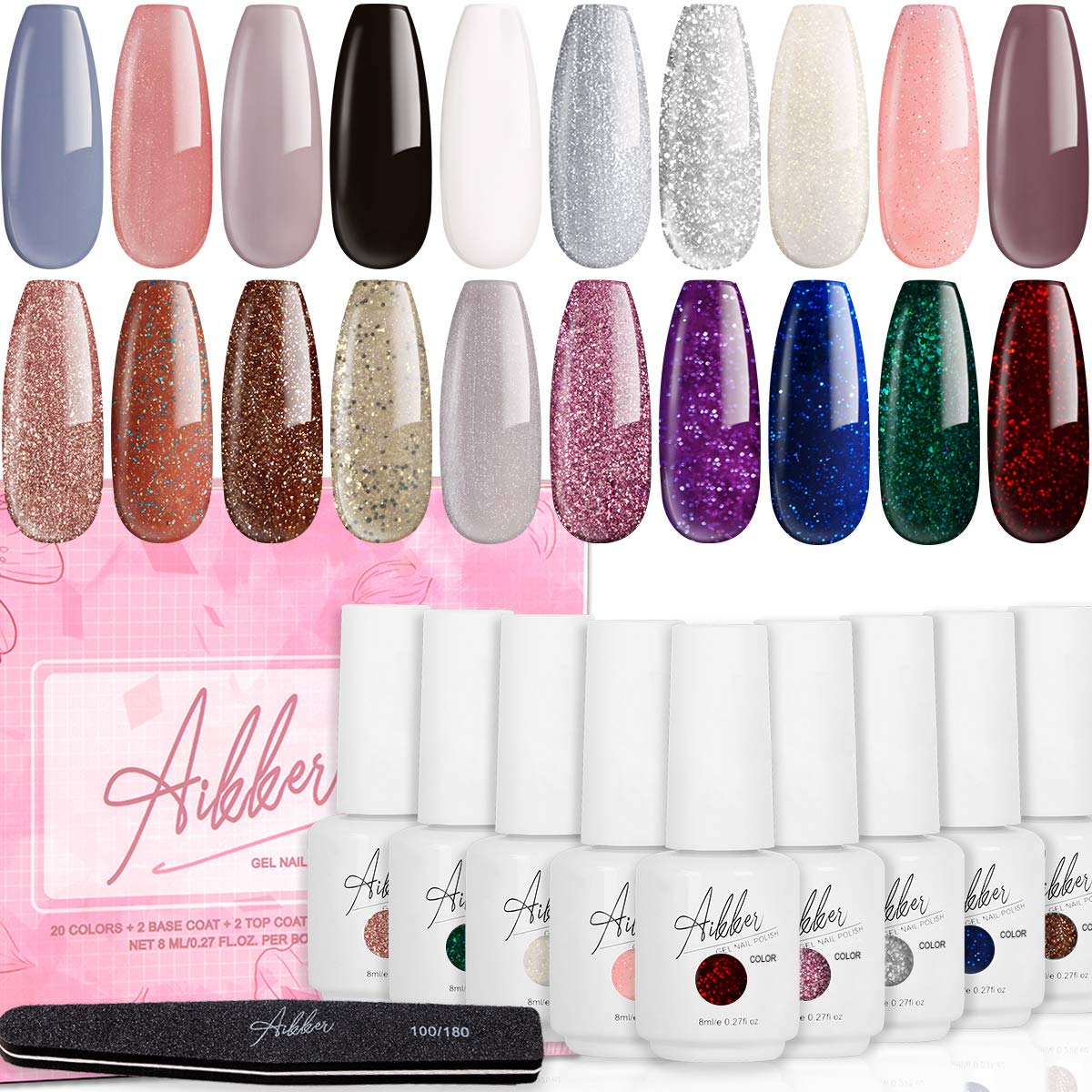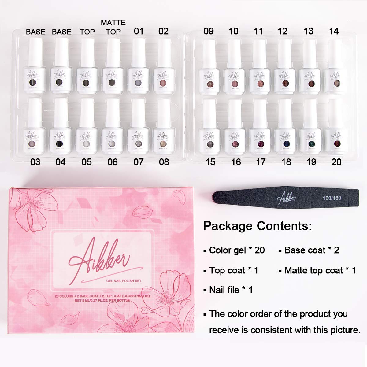 Aikker Large 8ml 20 Colors UV LED Soak Off Gel Nail Polish Starter Kit Varnish Gift Set with Base and No Wipe Top Coat Grace Set AK24