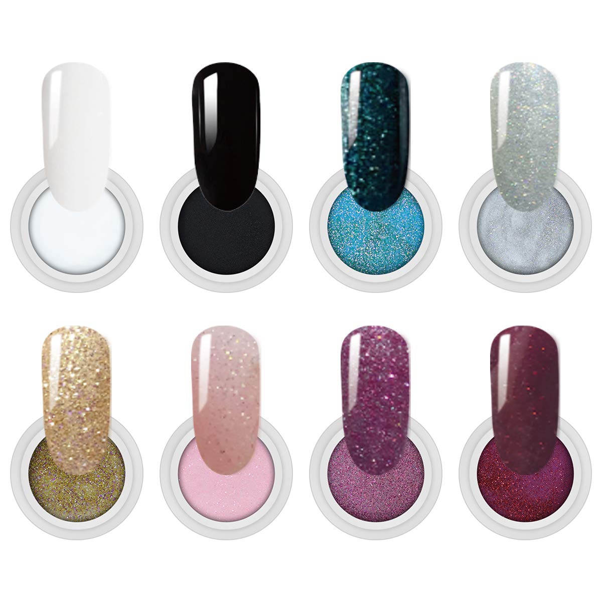 - Dipping Powder System: This Dipping powder nails set contains everything you need to start as a NEW, Which includes 8 jars of colored powder (0.34oz/10ml each jar) White,Black,Blue,Gold,Silver,Pink,Deep Pink, Red.the classic colors will always match your daily style and suitable for all the season.