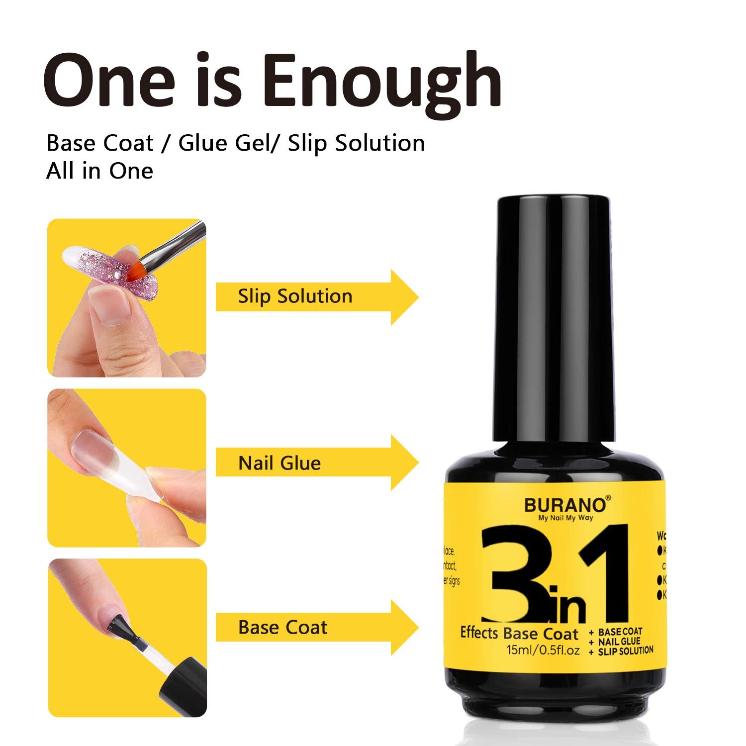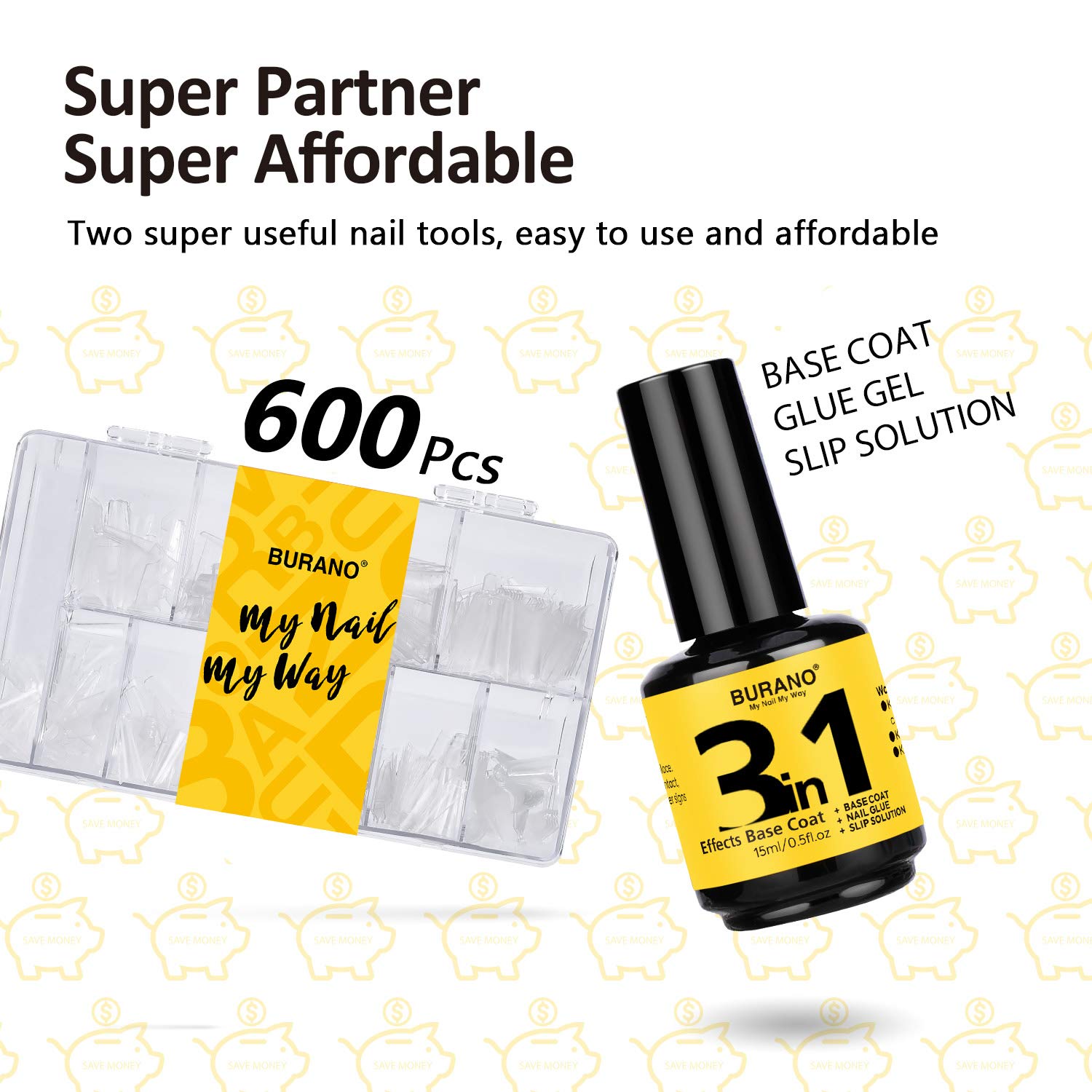 • Clear Half Nail Tips with Nail Glue Set –Very easy to shape & Durable after product is built. They're the perfect thickness for stability and not thin or flimsy. BURANO 3in1 Base coat can be used as base gel, nail glue and slip solution. It’s the best nail glue for the nail tips.