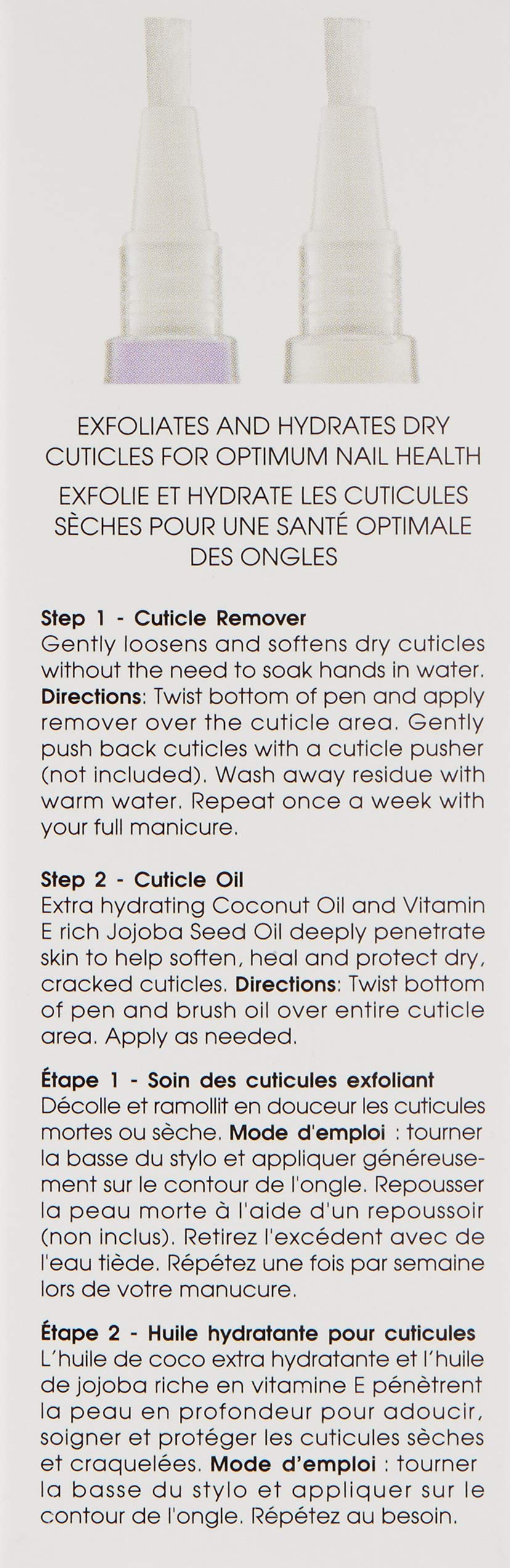 Convenient travel-friendly Cuticle Remover & Cuticle Oil Pens for professional cuticle care on the go. Nail your cuticle care regimen with the Deborah Lippmann Cuticle Protection & Repair set containing the all new Cuticle Oil and Cuticle Remover pens for professional, convenient nailcare on-the-go. The Cuticle Remover Pen exfoliates dry and stubborn cuticles. The Cuticle Oil moisturizes to prevent future rough and peeling cuticles. Twist bottom of Cuticle Remover Pen and apply remover over the cuticle area. Gently push back cuticles with a cuticle pusher (not included). Wash away residue with warm water. Repeat once a week with your full manicure and pedicure. Follow with Cuticle Oil Pen. Twist bottom of pen and brush oil over entire cuticle area. Apply as needed.
