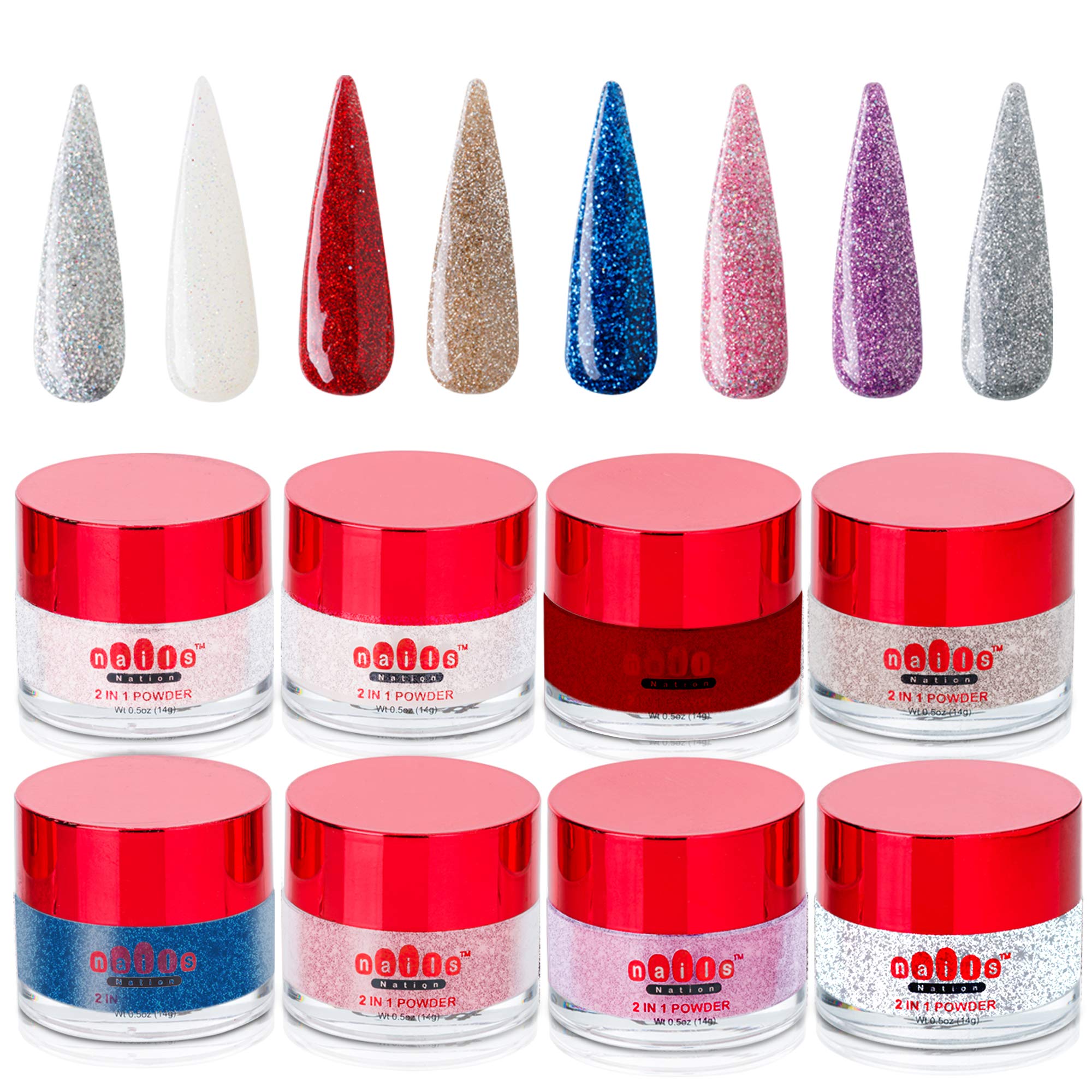 Dip Powder Nail Kit Starter - 8 Glitter Colors of 2-in-1 Nail Powder - Dip Application - No-Chip Shine for 3 Weeks - Strengthens Natural Nails - Fine Consistency, Easy Application