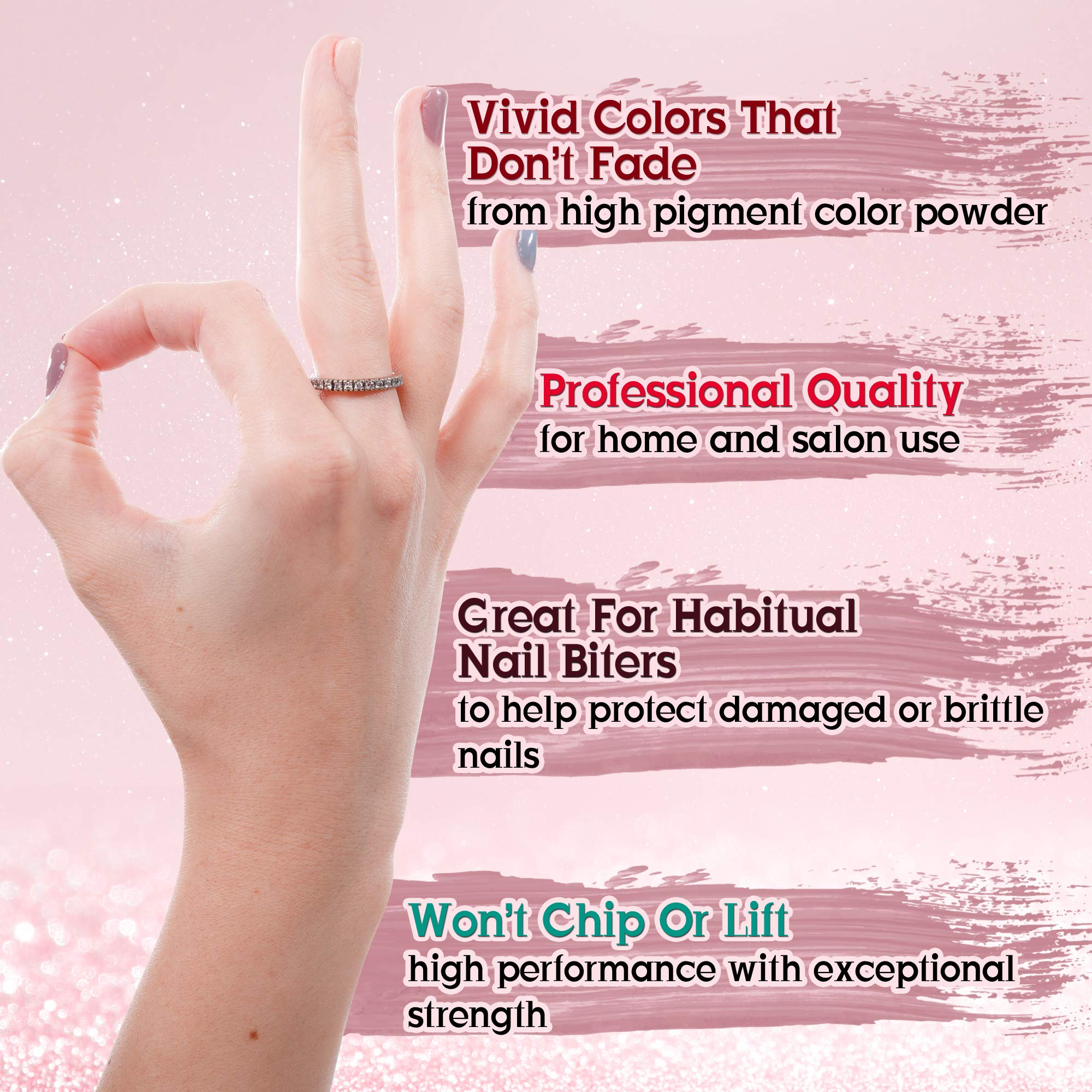 • ✔ Dip into dynamite looking nails ... This nail dipping powder kit starter has 8 fabulous shimmering acrylic colors to choose from: blue, hot pink. gold, holographic, silver, purple, and red. Ditch the boring manicure and go for all that glitter.