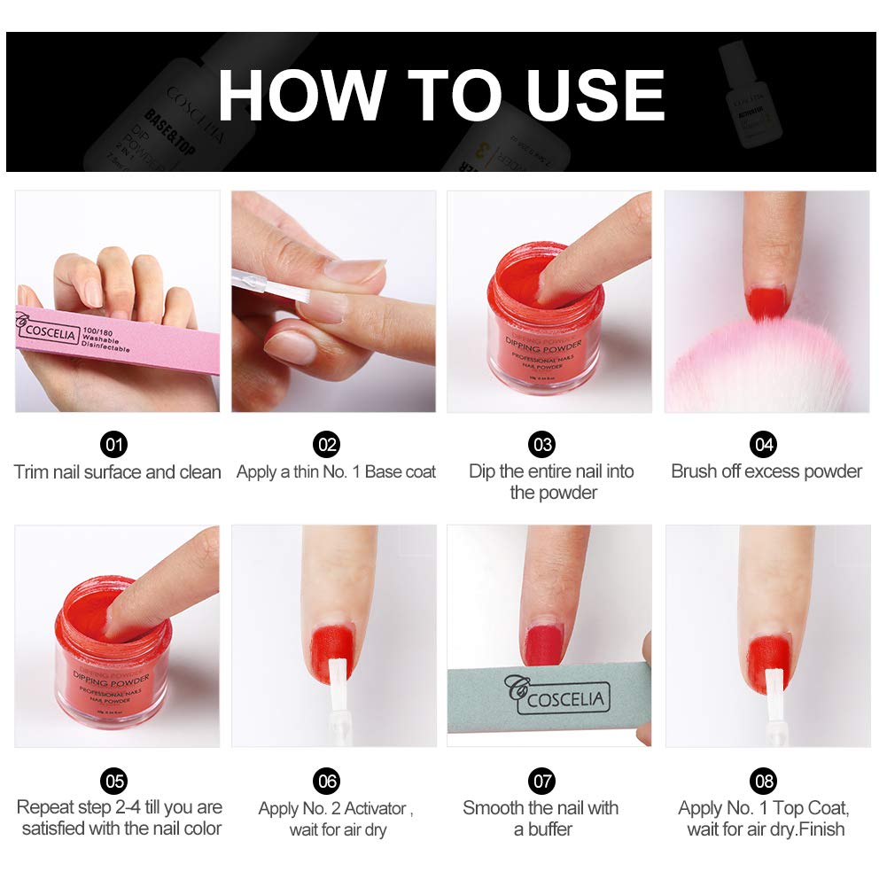- ☞ Fine Powder & Long-Lasting: Dip Powder Starter Kit is easy-to-use, compared to traditional nail lacquer, gel polish, and traditional acrylic systems, it doesn't need a nail lamp to cure. It feels and looks natural, is lightweight, and has impeccable shine.