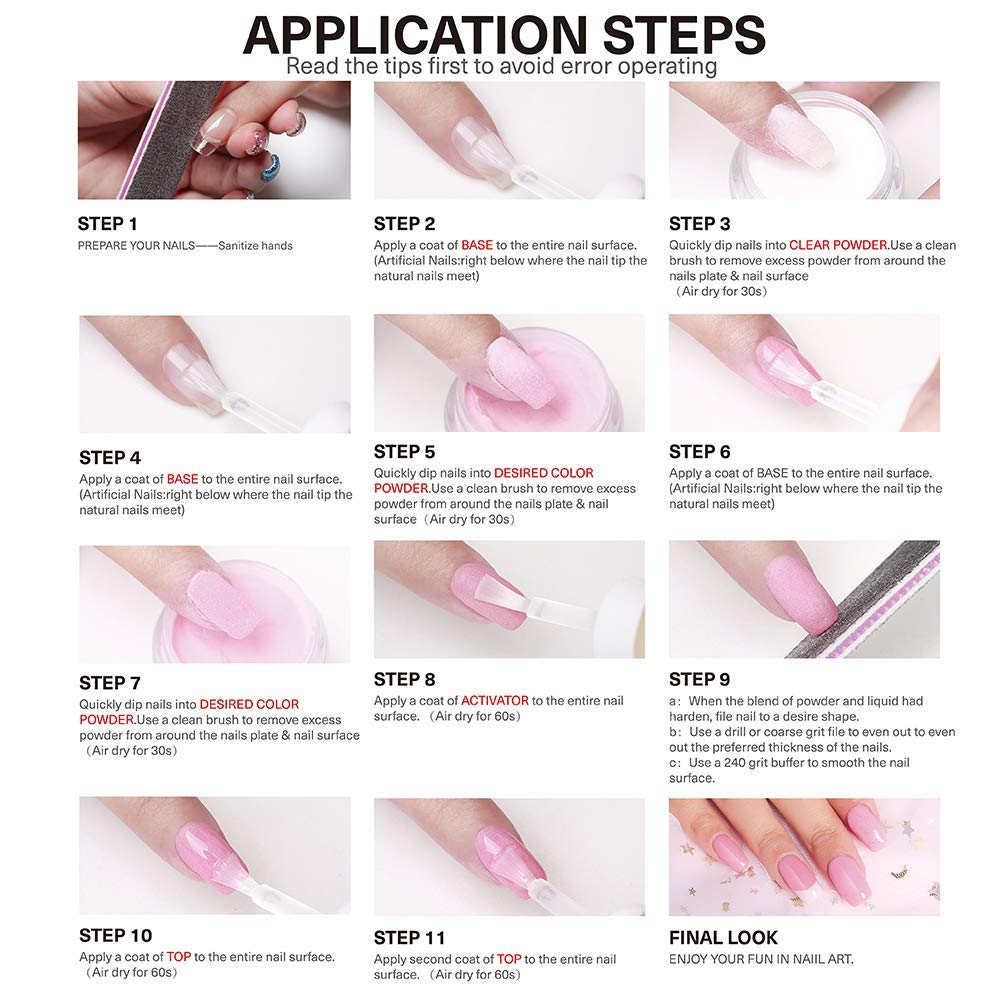 - ღWHAT YOU GET: Don't come with base coat, top coat, activator!!! AZUREBEAUTY 10 Colorful Dip Nail Powder Colors, One detailed user manual, 1V1 Custom online's service. If you have any problem, please contact us to get a refund or a replacement.
