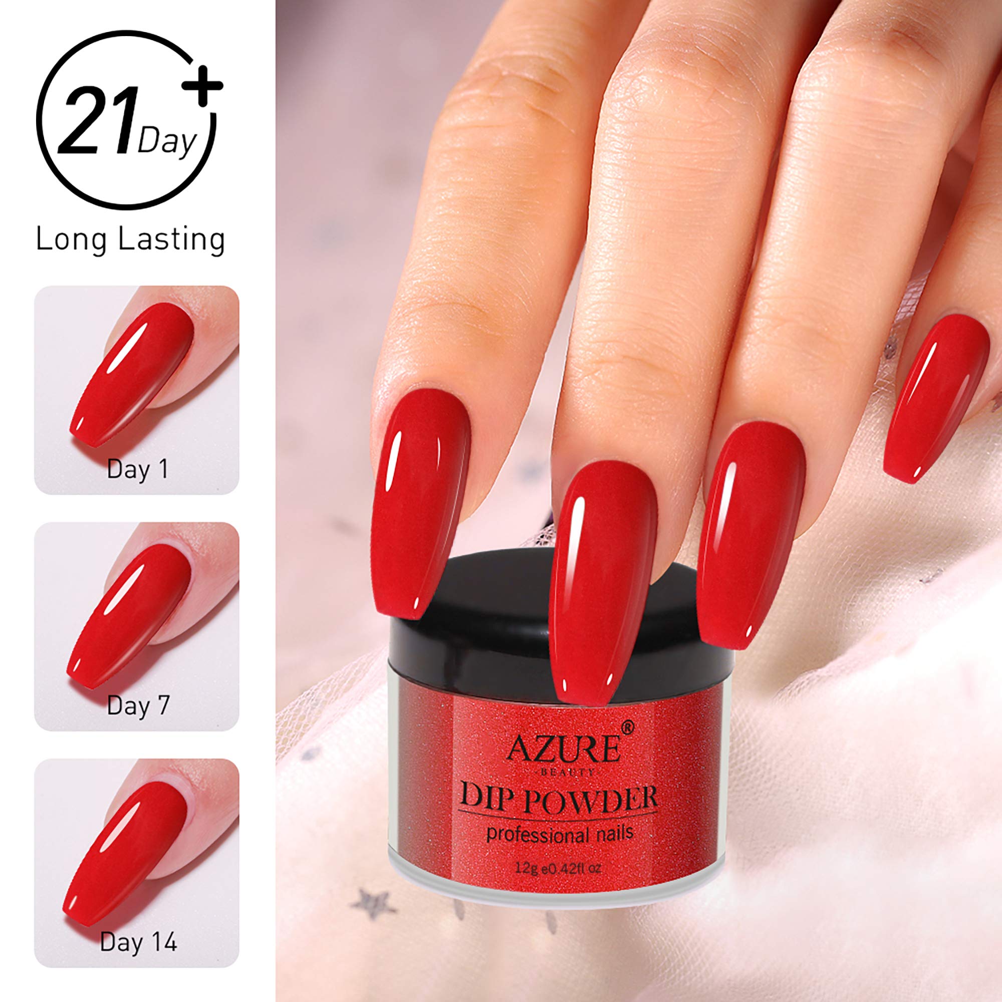 - ღFINE POWDER & LONG LASTING: AZUREBEAUTY Dip Powder Colors is long-lasting, chip-resistant because of AZUREBEAUTY special formula and advanced manufacture skill. Compared to traditional nail lacquer, gel polish, and traditional acrylic systems, it doesn't need a nail lamp to cure. It looks natural, is lightweight, and has impeccable shine. It can keep the nail art gorgeous and shiny for about 2weeks+.