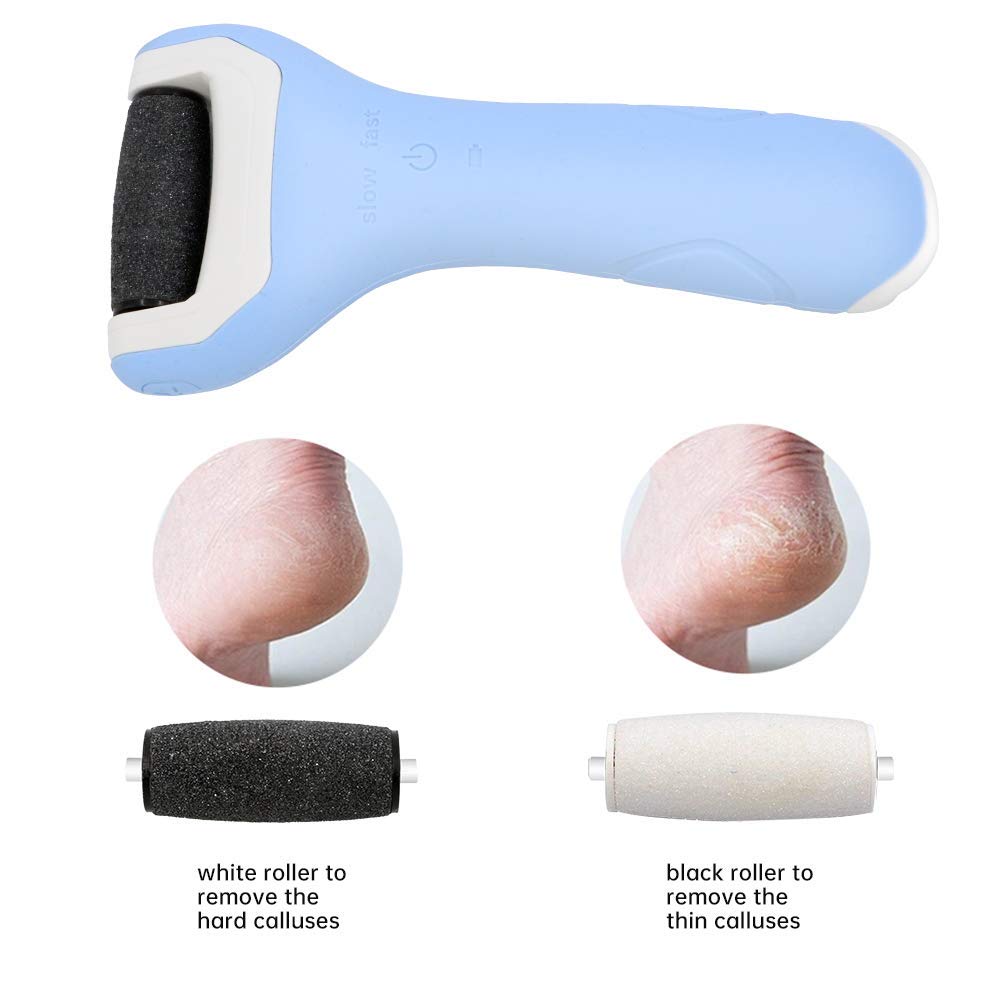 - [ TWO ROLLER HEAD ] Electric foot file callus remover professional contain two quality, one coarse rollers for hard skin and one fine rollers for soft calluses to fit all your needs. Also easy to replace and clean.