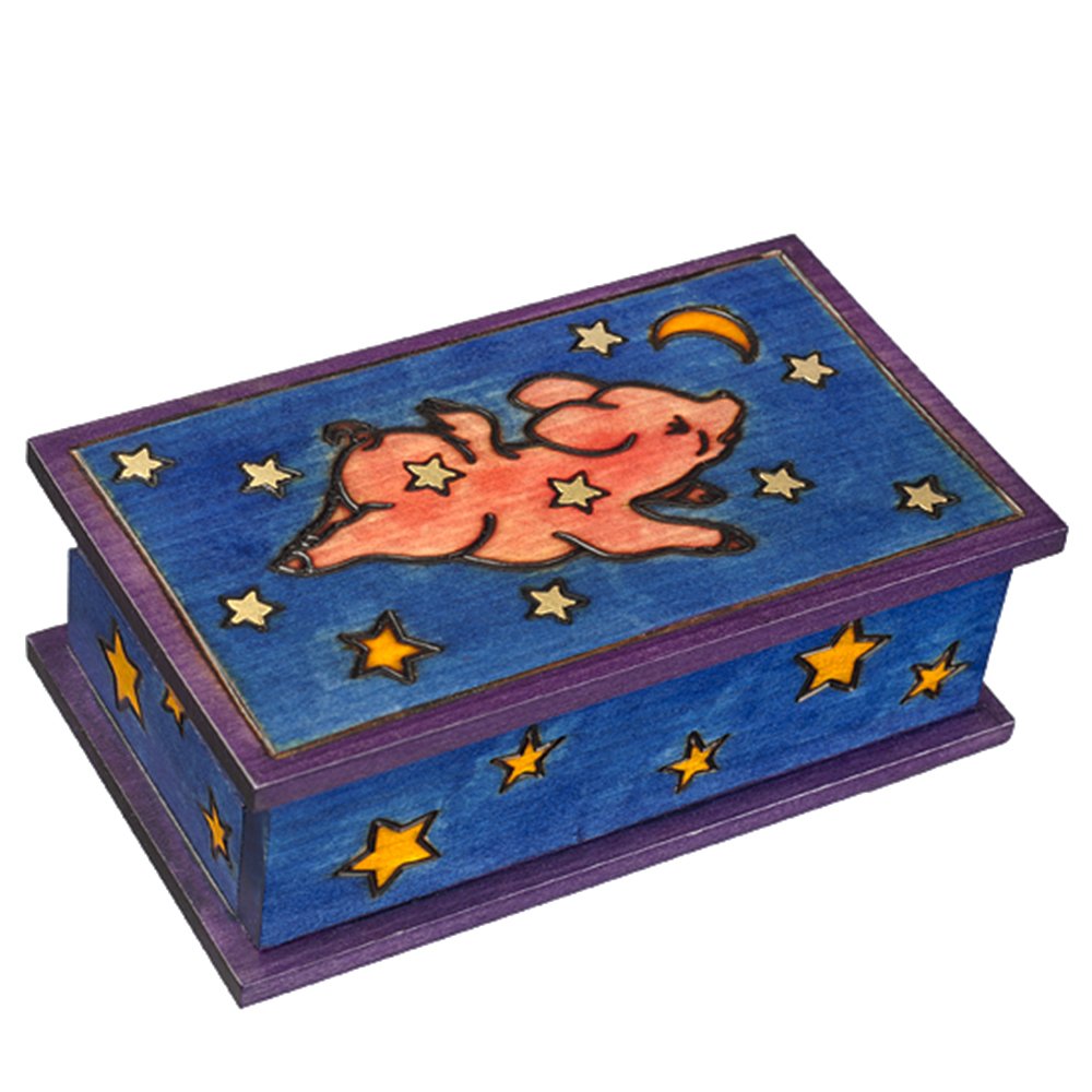 - This colorful trick box is decorated with a flying pig, stars and celestial. Slide front panel to the right and then lift the lid to open the box.