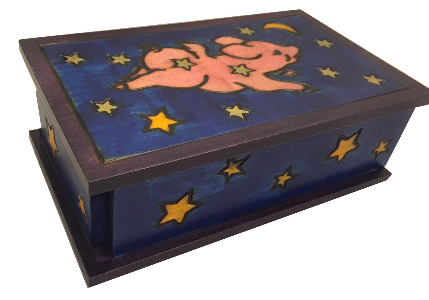 Flying Pig Secret Box Polish Handmade Linden Wood Keepsake Secret Opening Jewelry Box