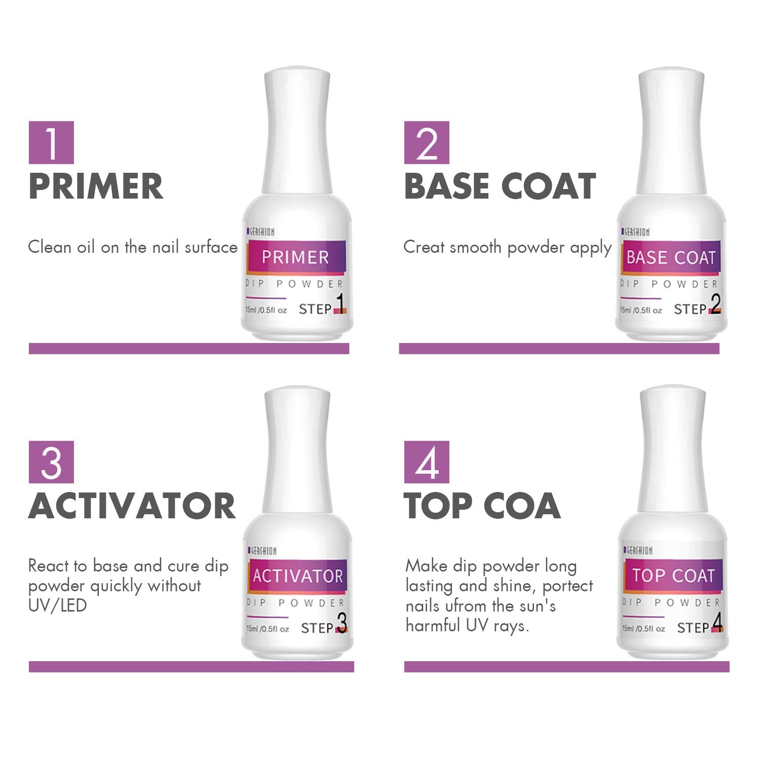 - 【NO NEEED UV LAMP】Compared to traditional nail lacquer, gel polish, and traditional acrylic systems, Gershion Dipping Powder don't need a UV/LED lamp to cure. Whether you are at home or traveling, you can manicure anytime, anywhere.