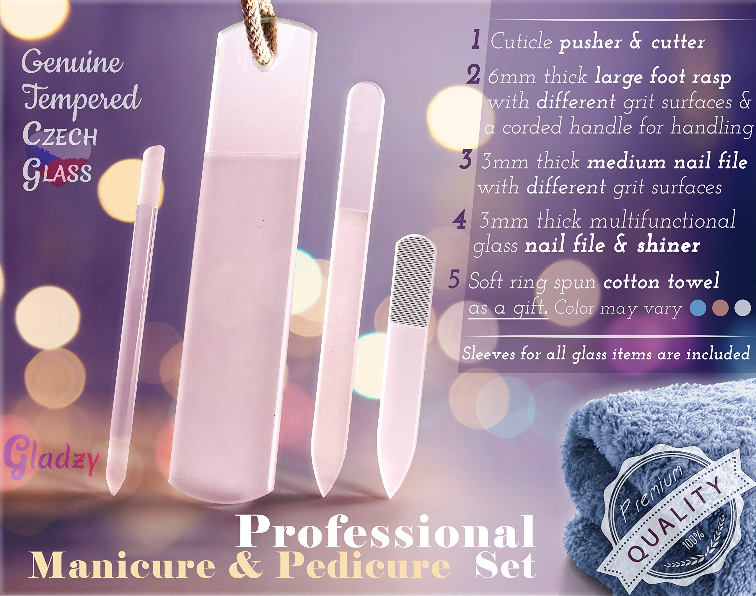GLADZY Genuine Czech Glass Nail File Set - Multi-functional Shiner Buffer, Callus Remover Foot Rasp, Precision Filing Cuticle Pusher, Etched Surface, Manicure & Pedicure, Professional Care, EU Quality by Gladzy Store