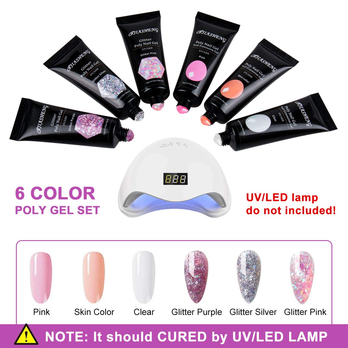 - Practical Nail Extension Gel Set: 6 colors poly nail gel, included 3 pure color- clear, pink, skin color and 3 glitter color-glitter purple, glitter pink, glitter silver, meet your most demands and you can use the different types color for different situations