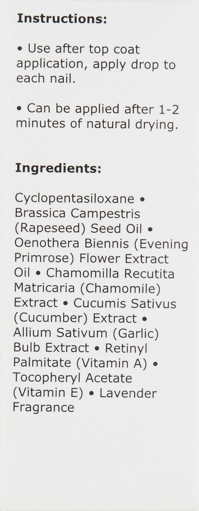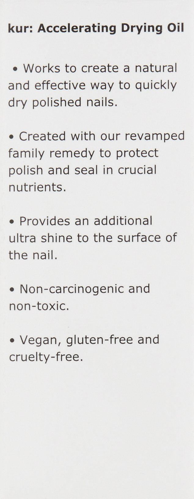 A fast and effective final step to quickly dry your manicure. Just a drop over fresh polished nails provides a natural way to seal in your manicure. Perfect for the woman on the go. Created with a remedy to protect polish and seal in crucial nutrients. Provides an additional ultra shine to the surface of the nail. Natural way to seal in your manicure.