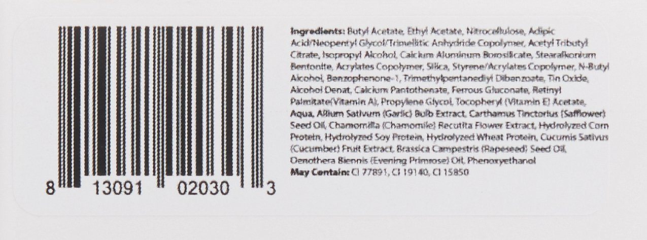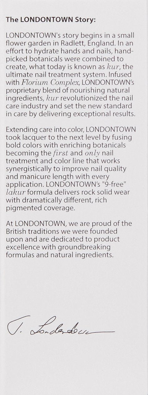 Developed to adhere to Londontown's Kur Nail Hardener; this reaction creates a molecular bond that reinforces nail strength and works to prevent nails from breaking, cracking and splitting. Infused with our revamped family remedy and a unique blend of vitamins and minerals to enhance healing and nail health. Long lasting shine."9-free," does not contain the toxic chemicals: formaldehyde, toluene, DBP, formaldehyde resin, camphor, xylene, ethyl tosylamide, tphp, acetone. Vegan, Gluten-Free and Cruelty-Free.