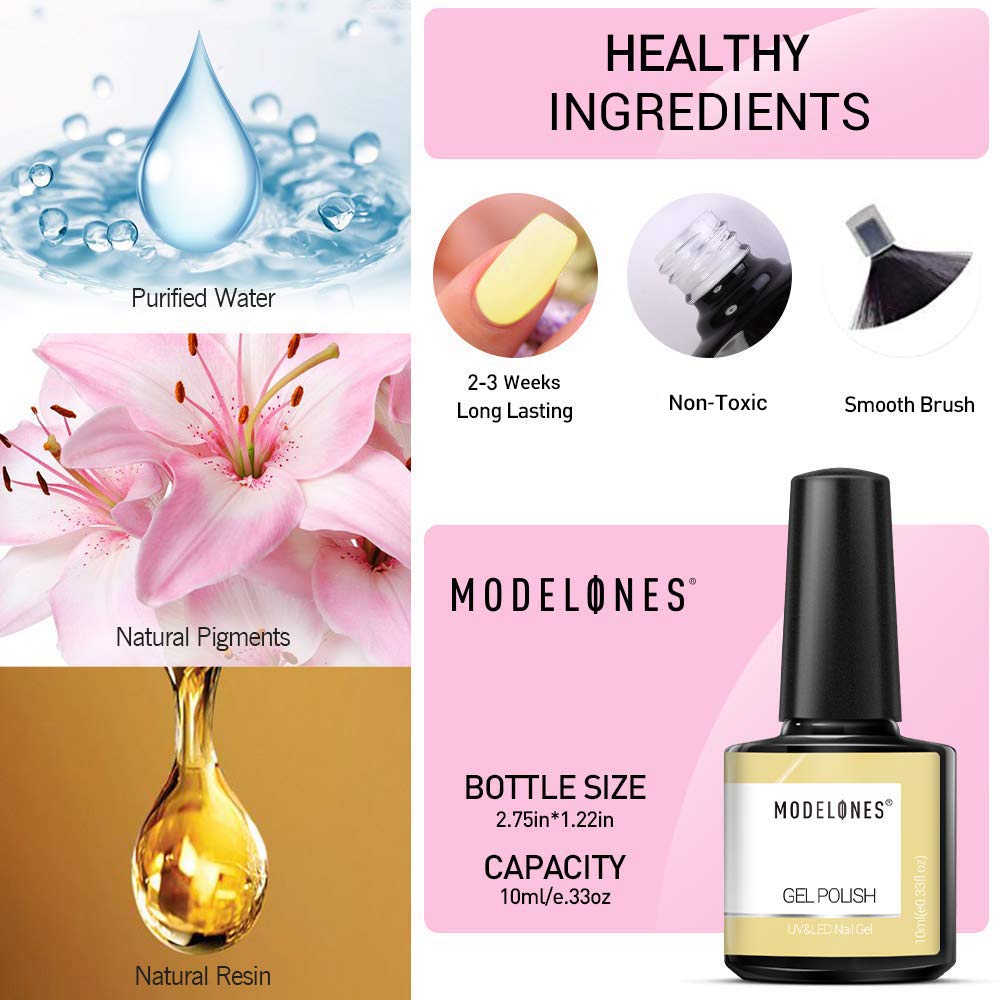 - ★ MODELONES GEL NAIL POLISH: Ladies' nail-care priorities which can make you more dazzling in the crowd . Item included Color-showed Bottles+ 6 PCS Color Gel Nail Polish( 10ml/ each)+ Unique Gift Box. All the colors are suitable for any working or dating occasion.