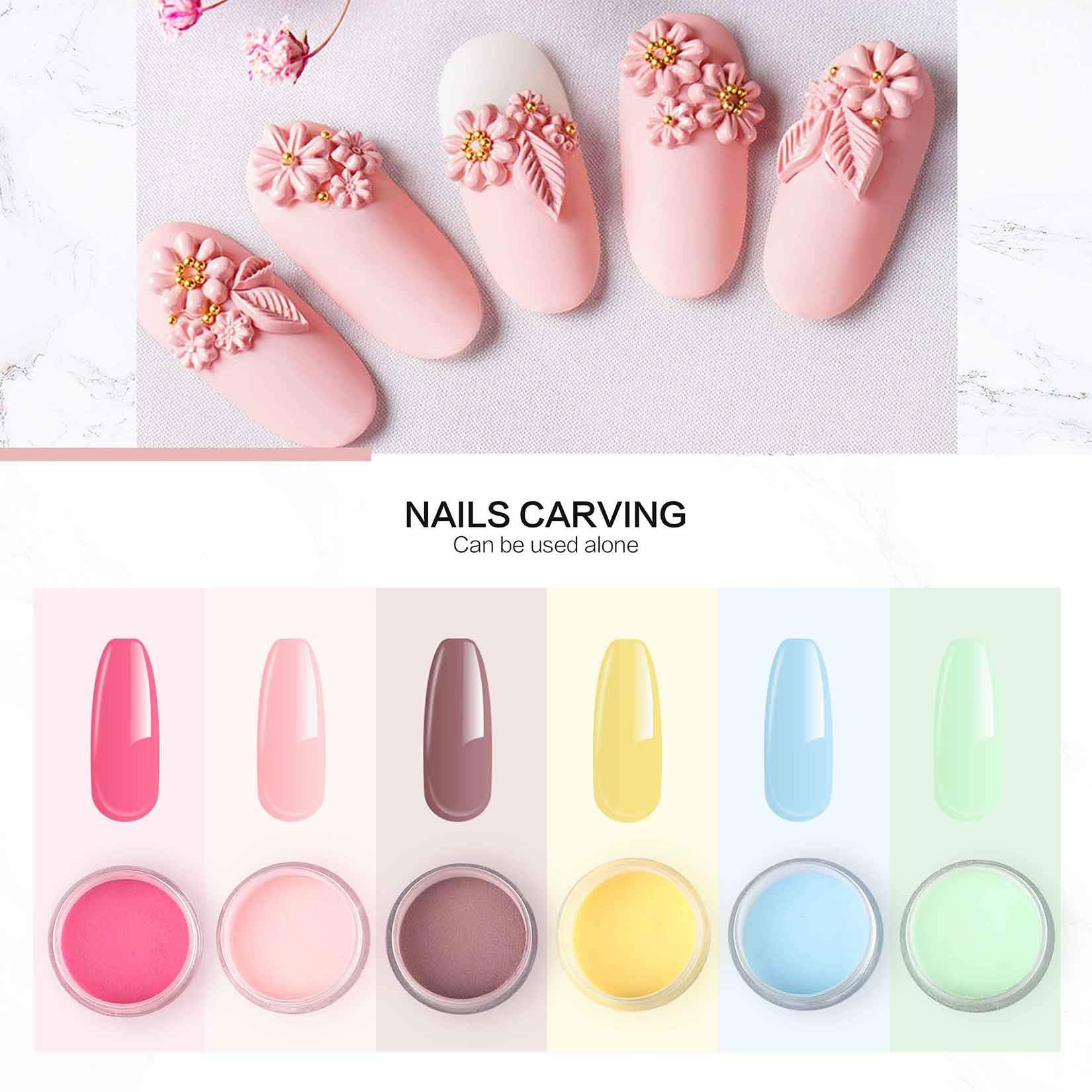 - Acrylic powder: you will get three types of nail acrylic powders for choosing ( acrylic pink powder, acrylic white powder, acrylic clear powder) and 6 colored acrylic carving powder. use with acrylic liquid monomer, feel free to enjoy your acrylic nails art journey in this acrylic nail kit