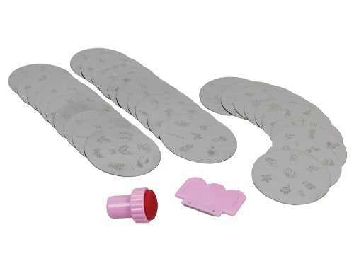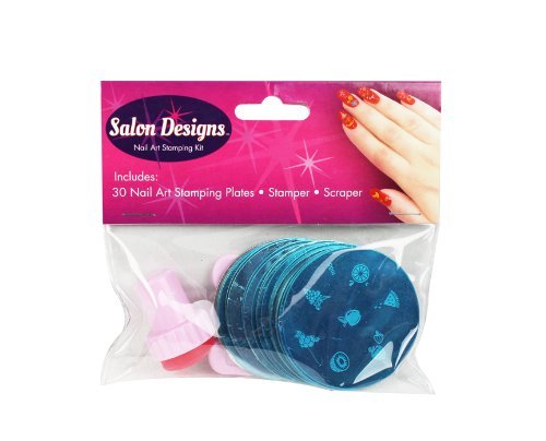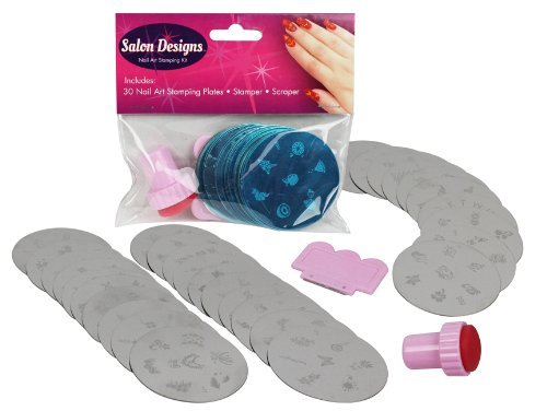Nail Art Polish Stamping Manicure Kit- 30 Plate Set with Stamper and Scraper by Salon Designs: This professional set includes 30 unique plates, scraper, and stamper- everything you need to create your own beautiful nail art. Each stainless steel plate features 6 to 10 designs and comes with a protective blue film. This kit saves you time and money- no more trips to the salon! Includes a mix of individual images, full nail, and french tip designs.