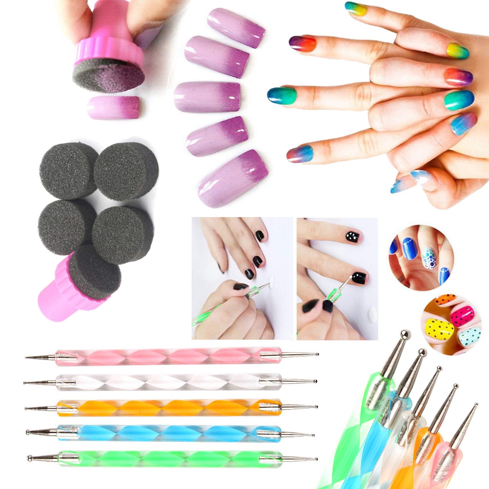 • 5 wheels of nail decoration rhinestones, with different styles, multi- colors. Nail stamping sponge helps you to imprint gradient colors polish on nail.