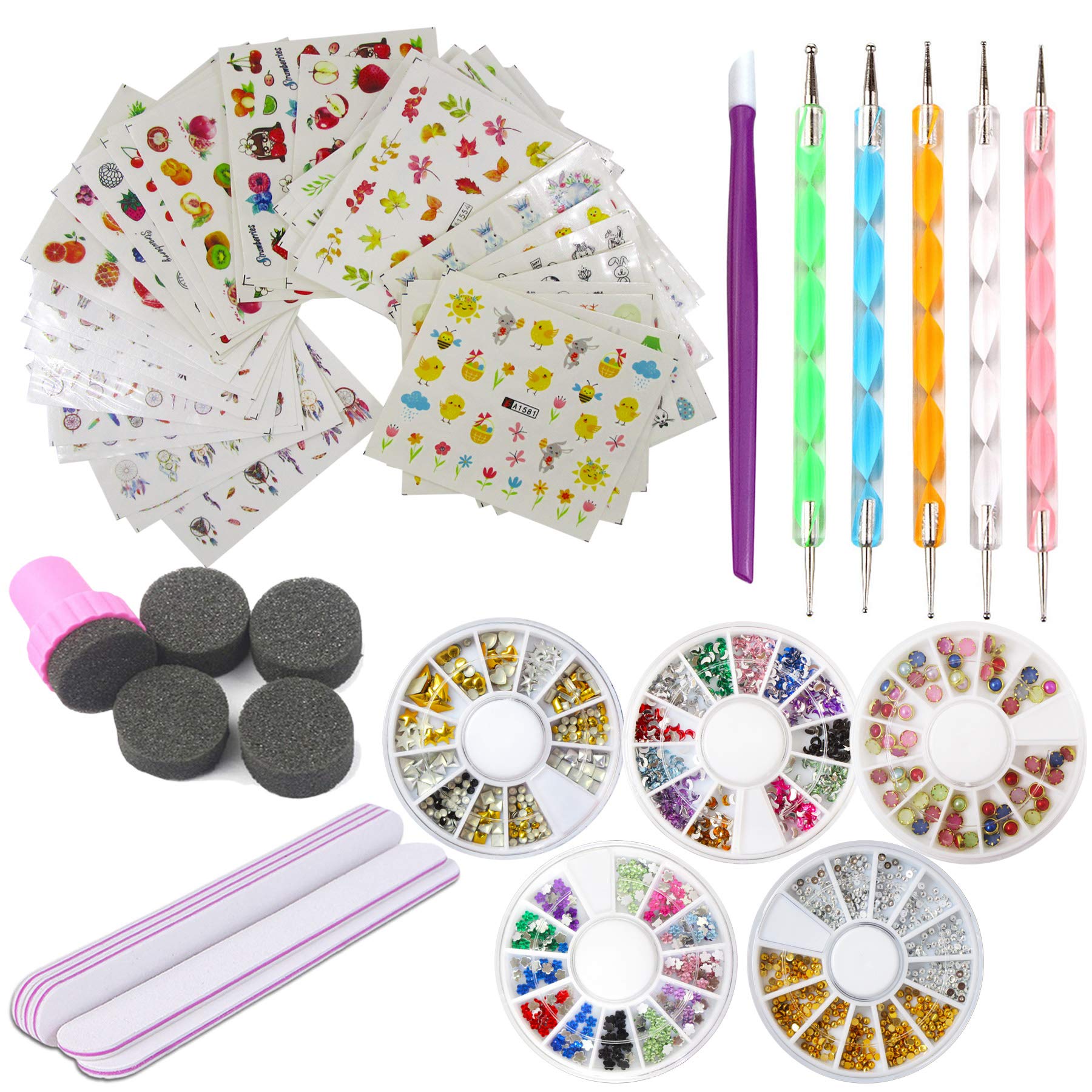 Nail Art Tools Decoration Manicure Kit Set 48 Sheet Water Nail Decals Stickers,5 Boxes Nail Beads Rhinestones Stone Gold Metal Studs,5 Nail File Sticks,5 Dotting Pen,Stamping Sponge Pusher