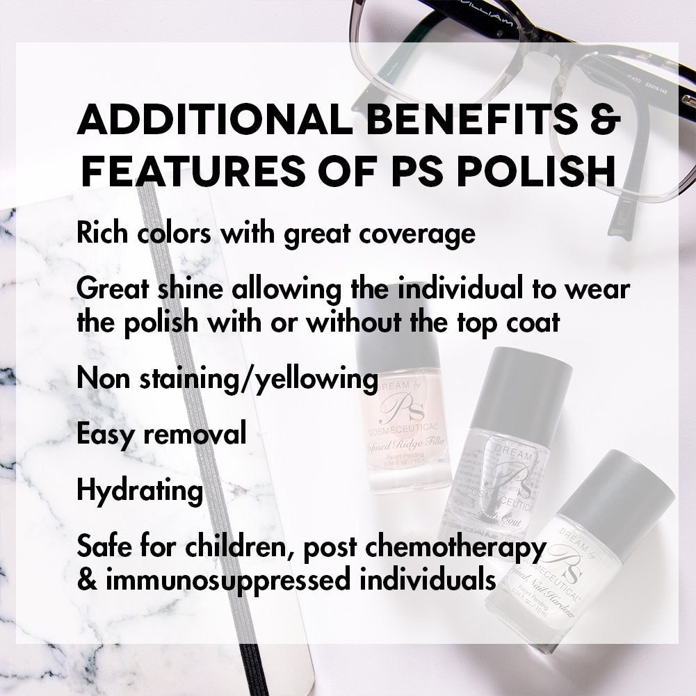 - PROFESSIONAL LOOK, NO HARMFUL CHEMICALS – This mission of PS Polish is to provide a cleaner and safer alternative in the nail polish industry. Our doctor formulated nail polishes are created and made in the USA and held to a higher standard. Not only are they vegan with no testing done on animals, they are meant to provide the safest nail polish option for you and your family. The nail polishes are non-staining, hydrating, and safe for children, post chemotherapy & immunosuppressed individuals
