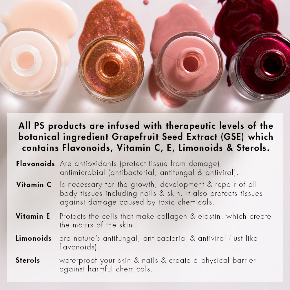 **SHOP WITH CONFIDENCE AT PS POLISH:** When you purchase our products, you receive protection that is not available through any nail product line on the market today. Our products include a proprietary formula infused with the botanical ingredient Grapefruit Seed Extract (GSE) which is well known for its medicinal uses.