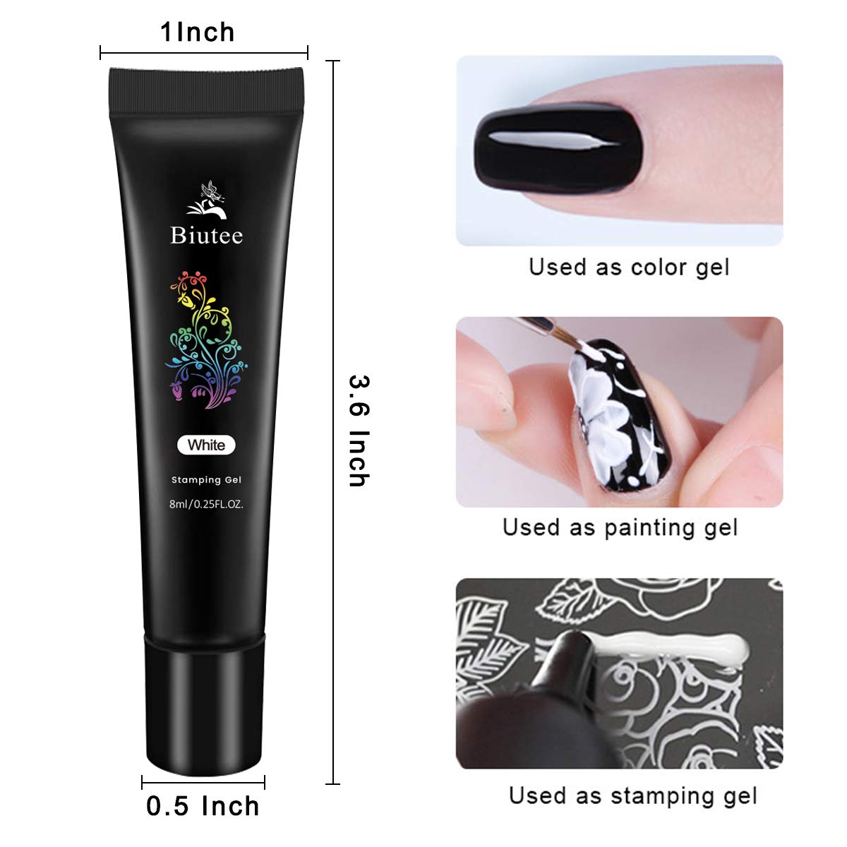 **Package:** Double packing: In addition to packaging box, each stamping gel has a separate air-tight packaging to ensure that it is brand new and intact. **How to Use:** ①Apply base coat and cure under nail dryer. ②Apply nail polish/gel and cure under nail dryer. ③Apply our stamping gel on your nail template. ④Use the scraper to remove extra nail stamping gel. ⑤Use the stamper to pick up the image. ⑥Print the image onto your nails in right position and cure under nail dryer. ⑦Apply top coat and cure under nail dryer.