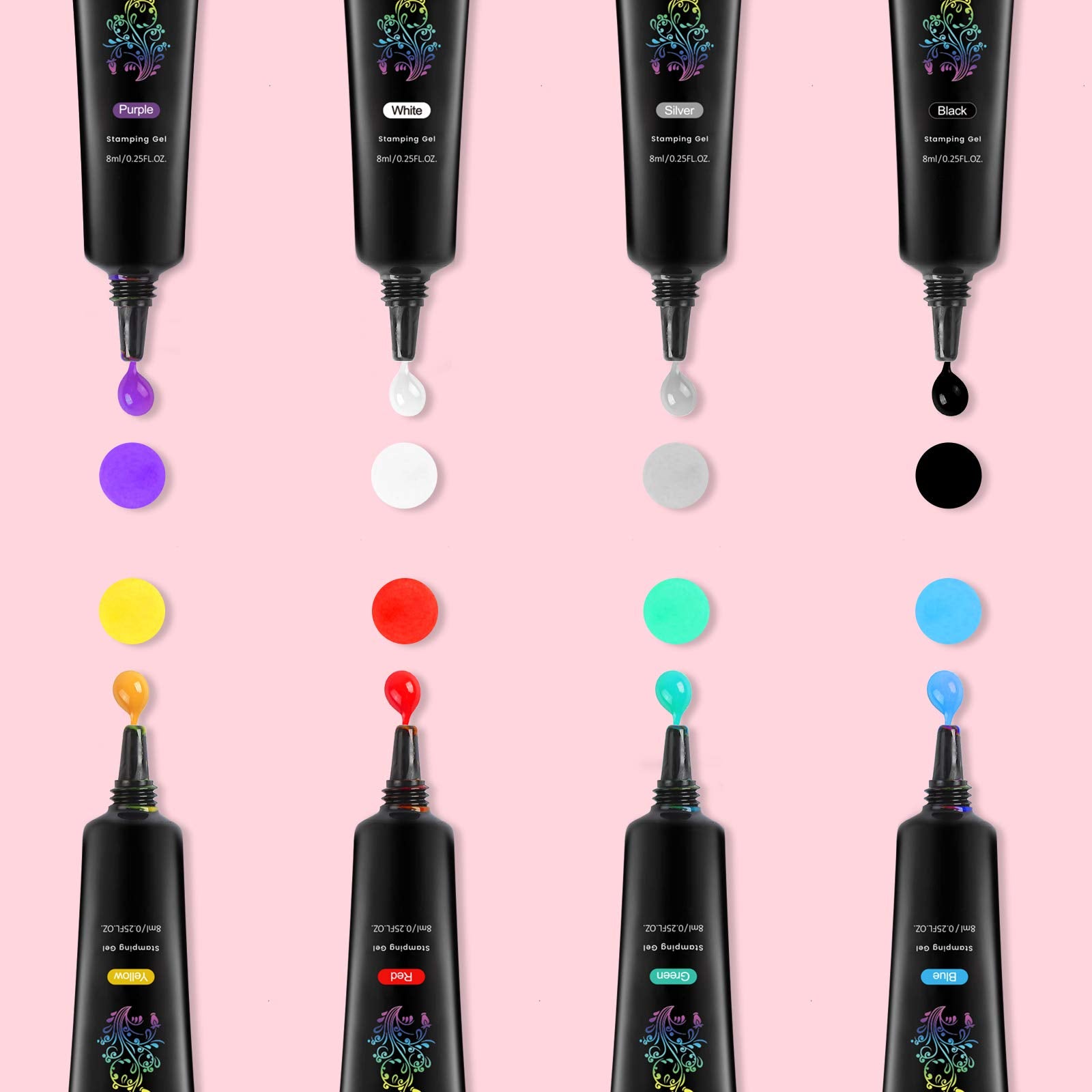 • ►Package: SEISSO Nail Stamping Polish kit includes: 8× 8ml Nail Stamping Gel (White, Purple, Red, Golden, Green, Silver, Blue, Black). Notice: Nail stamping plate and other nail tools are not included.