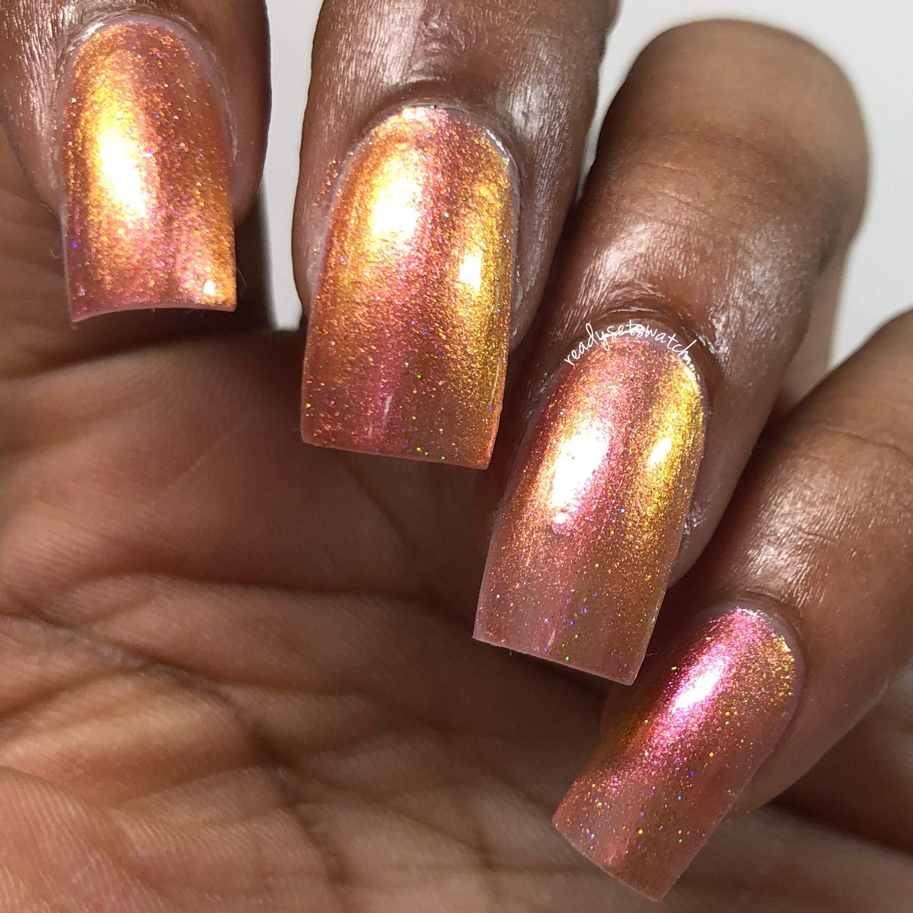 From rosé to ale to cider or cola, meeting up with friends for drinks can add cheer to any season. Spending time catching up, reminiscing and sharing laughs is a perfect way to end a chilly winter’s day. Stay Toasty My Friends is a warm, rosé-colored chrome that quickly shifts into golden shades of champagne. A strong pink shift and micro bits of holo glitter complete this toasty shade. Best in 2-3 coats. Type: Multichrome w/Holo Flakes Base: 5-Free Glitter Load: None Glitter Size: None Recommended Coats: Best in 2-3 coats Notes: None Additional Information This listing is for a standard full-sized 15ml /.5oz bottle with our glitter grabbing flat brush. Two stainless steel balls are included in every polish bottle. Ingredients: Ethyl Acetate, Butyl Acetate, Nitrocellulose, Adipic Acid/Neopentyl Glycol/Trimellitic, Anhydride Copolymer, Isopropyl Alcohol, Acetyl Tributyl Citrate, Silica, Benzophenone-3, N-Butyl Alcohol, Violet 2 May Contain: Aluminum Powder, Mica, Iron Oxide, Ferric Ferrocyanide, Ultramarines, Red 6, Red 22, Red 30, Red 28, Red 34 , Red 7, Orange 5, Yellow 5, Yellow 11, Yellow 6, Yellow 10, Blue 1, Black 2, Violet 2 Ext, Titanium Dioxide, Synthetic Fluorophylogopite, Calcium Sodium Borosilicate, Polyethylene Terephthalate, Polyurethane 33, Silver, Chromium, Magnesium Fluoride, Bismuth Oxychloride. Please note: while we do our best to ensure colors match on several devices on our end, the device you view this listing on may not accurately reflect the color of the polish. Photos are provided to us for use by the respective bloggers, and colors may show differently depending on lighting, skin tones, and camera equipment used.