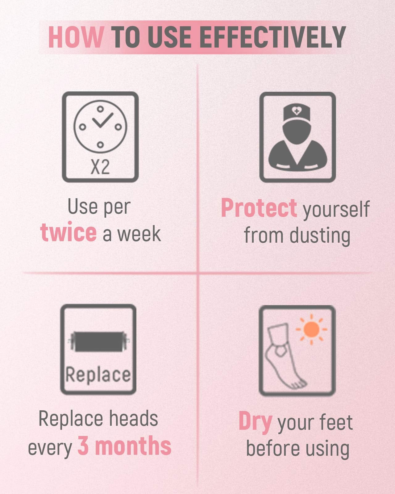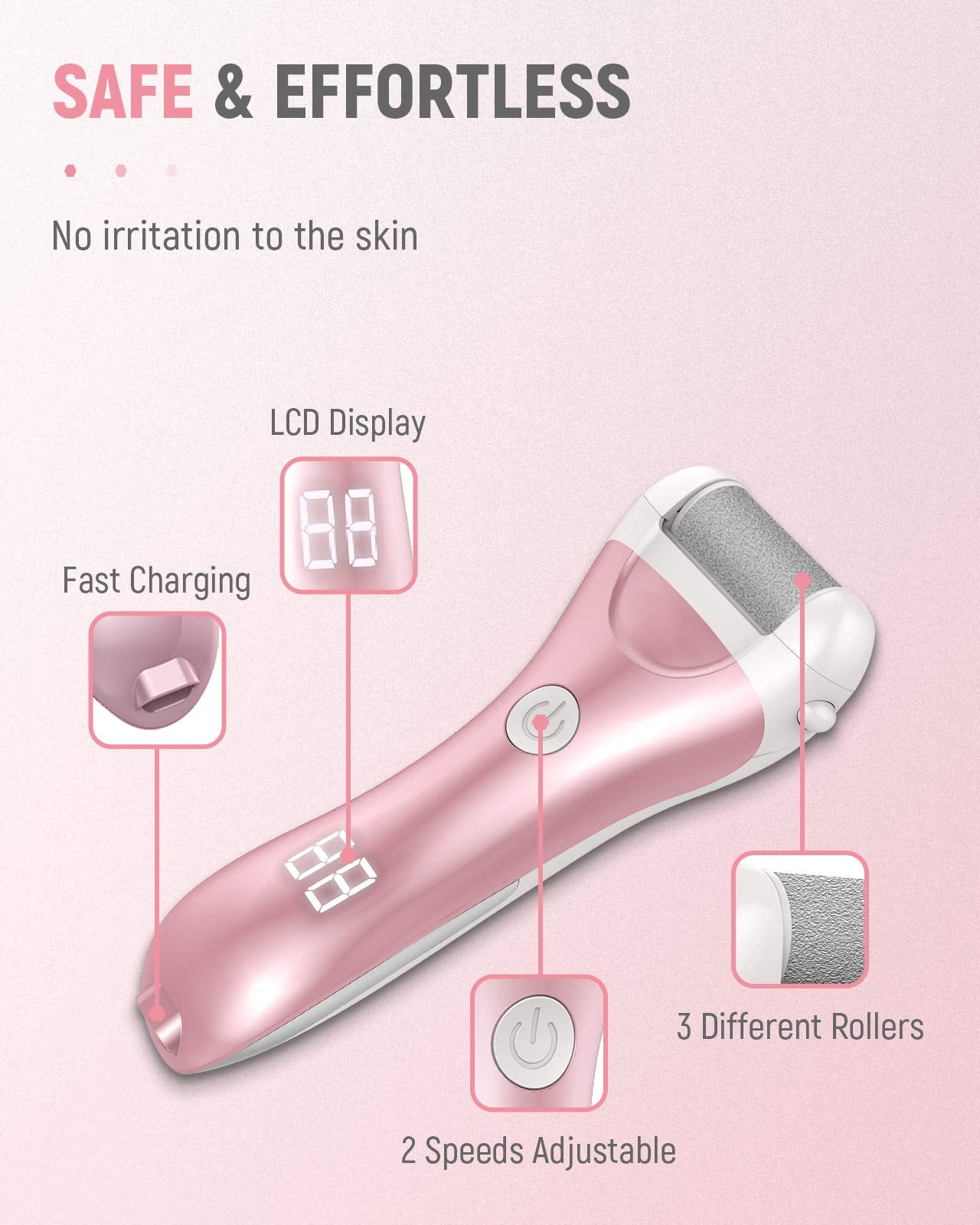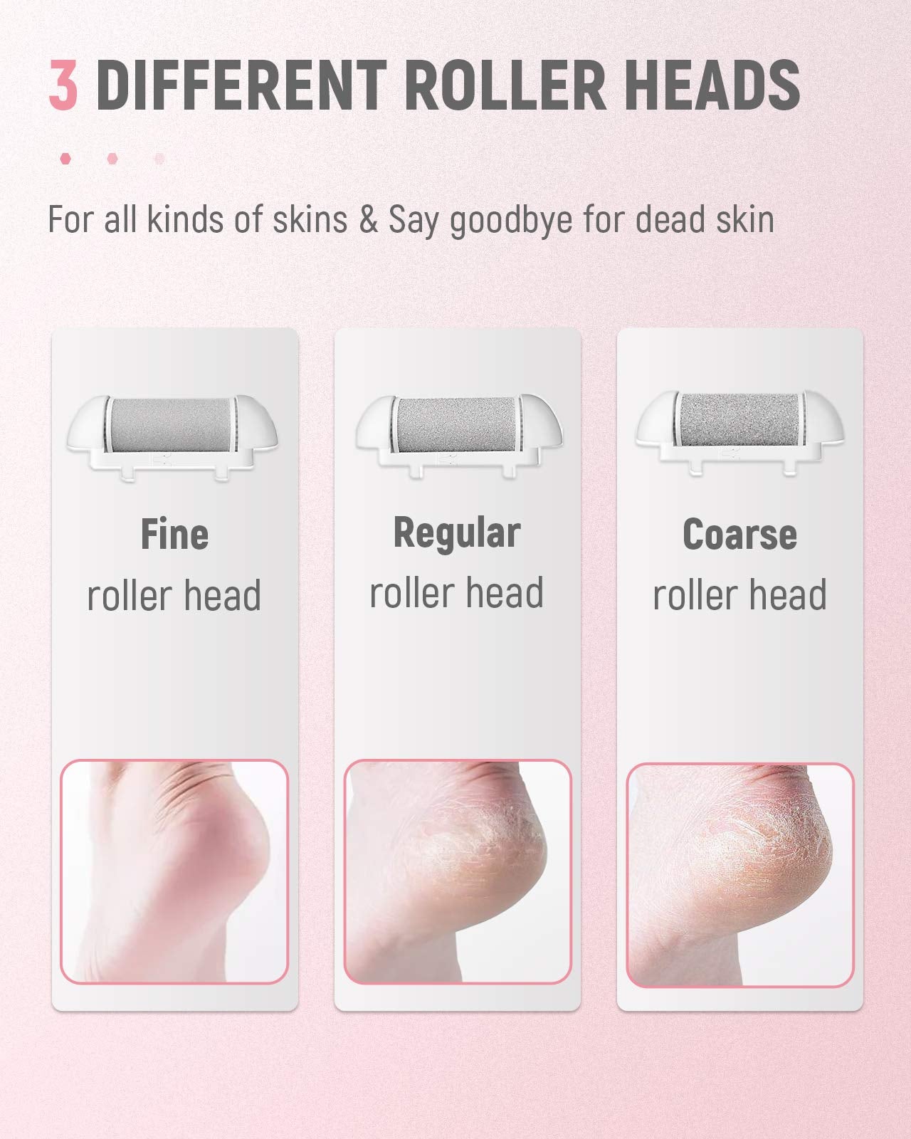 • {3 Senior Quartz Sand Roller Heads} Callous remover for feet has 3 different quartz sand rolling heads, coarse rolling head can remove stubborn horny dead skin, medium rolling head can remove rough dead skin, fine grinding head use for daily care. You can choose suitable grinding head to keep your feet restore the delicate and smooth skin.