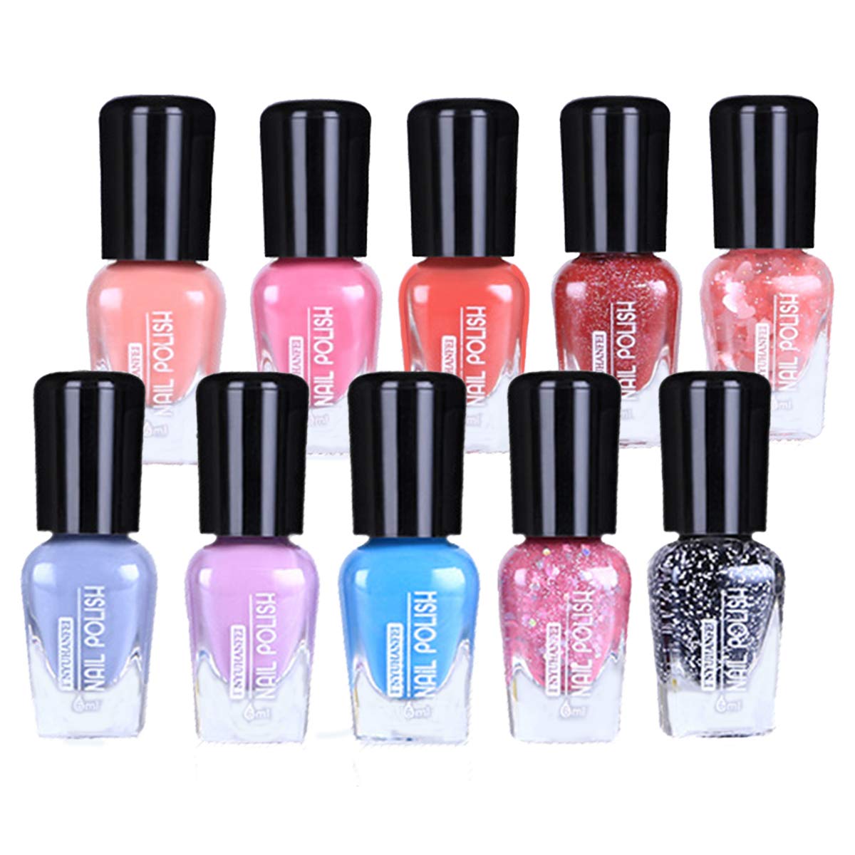 **Professional nail polish has stylish, latest colors that can complement your skin tone and wear. You can have different nail colors every day** **Features:** ☛Made of eco-friendly material, no irritating smell, no-harm to skin ☛Water-Based Peelable Formulation ☛Easy to be peeled off directly ☛66% Aqua, Mineral pigments, Polyurethane resin. The low-odor formula, safe nail polish for both adults & children **Package Contents:** 10 Pcs Water-Based Nail Polishes Set ( 6ml/Bottles ) **How To Use?** ①.Soak Cotton Pad with Polish Remover, Clean Along the Nail and Surface. ②.Apply a Thin Layer of Base Coat, Please Do Not Apply it Repeatedly, After Dry-up. ③. Apply The First Layer of Colored Nail Polish , After Dry-up, The Color is a Little Light. ④.Apply the Second Layer of Colored Nail Polish After Dry-up, You Can See Full and Uniform Color. ⑤.Apply the Last Layer of Top Coat After Dry-up, To Protect Nail Polish and Brighten Your Nails. **Long Lasting secret:** ♦Soak cotton pad with polish remover, Clean along the nail and surface ♦Do housework with gloves to avoid contact with water for a long time ♦Do not take a shower and wash your hair within 4 hours after you have just finished nail polish **IMPORTANT NOTICE:** 1.Water-based nail polish keep time will be lower than gel nail polish, this is the commonality of all water-based nail polish. 2.This nail polish is not a food or drink, please avoid kids swallowed, and eyes contact.