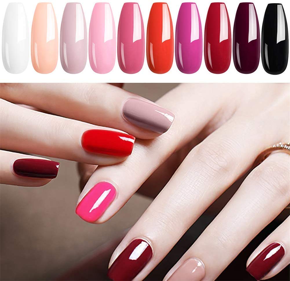 • The gel nail polish kit set includes 10 gorgeous colors of Toxin Free Gel Polish with low odor and top coat & base coat kit - No harsh ingredients or adhesives that lead to damaged nails.