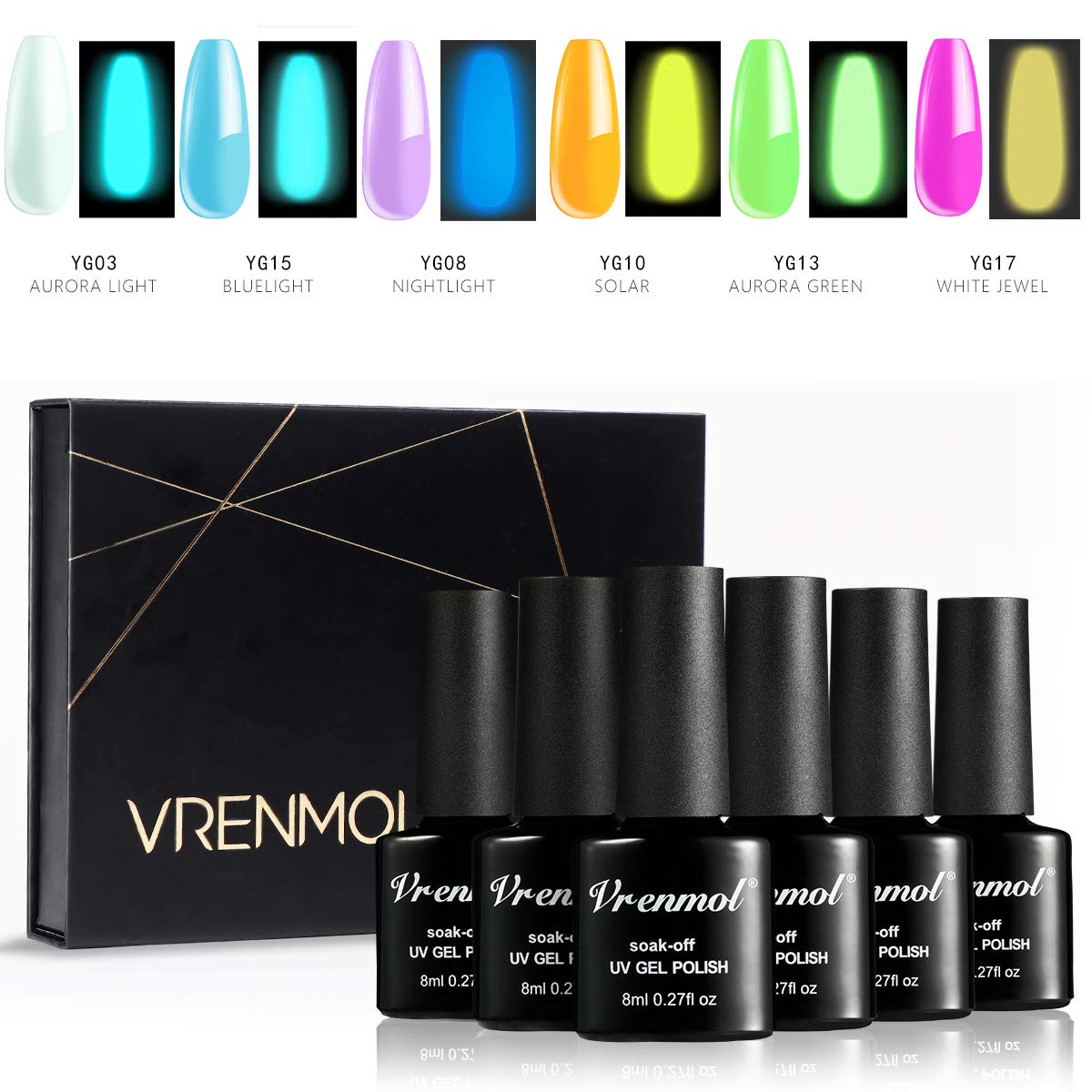 Vrenmol Glow in the Dark Gel Nail Polish Neon Shellac Nail Gel polish Soak Off UV Glow Effect Nail Polish Fluorescent Bright Colors Lacquer Nail Art-6 PCS 8 ML by vrenmol Store