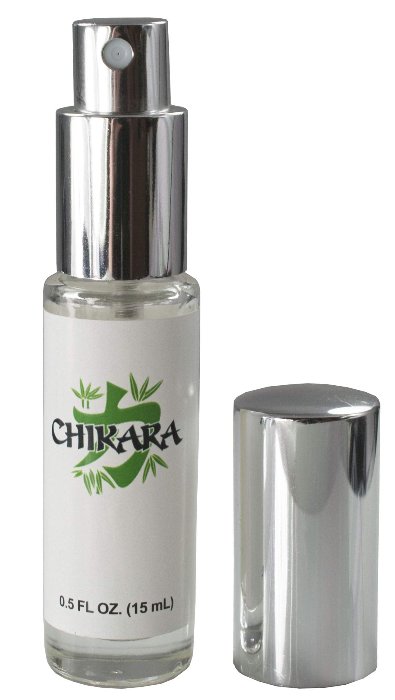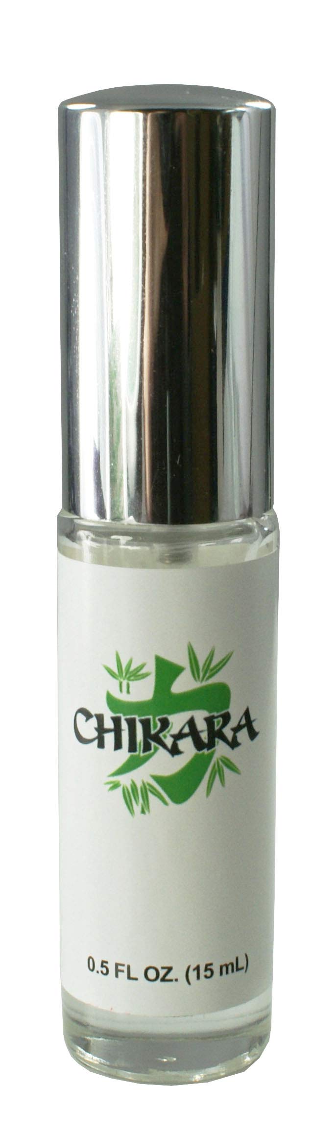**Chikara Pheromone Cologne for Men** comes in a 15 ml atomizer bottle.