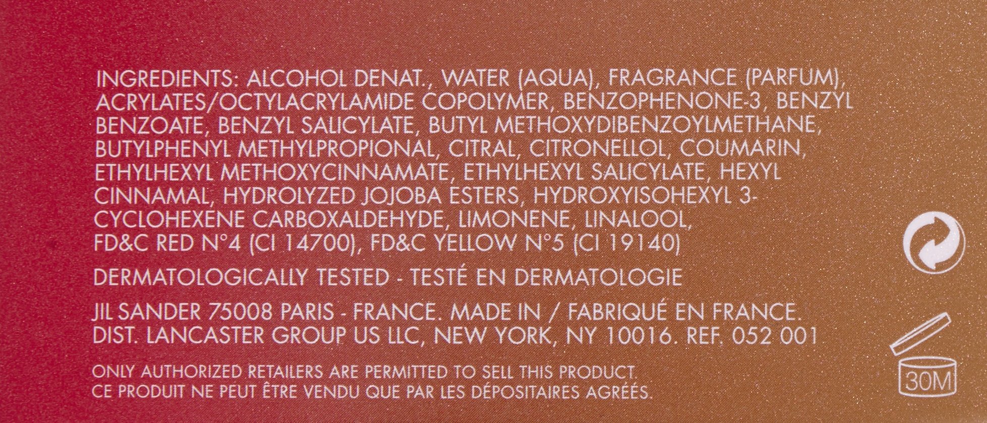 30ml/1oz Sun Delight Brand: Jil Sander * A floral fruity fragrance for women * Sweet * warm * sensual * Top notes comprise mignonette * passion fruit * Sicilian bergamot * Middle notes are dark chocolate * vanilla * frangipani * Base notes are woodsy notes * cedar * musk