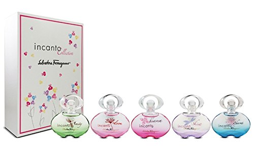 Encircle yourself with the floral infusion stemming from this five-piece eau de toilette set launched in 2014 by Salvatore Ferragamo for the woman who desires sweet options. Luxuriate in the floral notes of freesia found in Incanto Bloom or tropical overtones of pineapple in Incanto Dream. Incanto Charms tempts the senses with a flirty dose of passionfruit while Incanto Shine brings juicy peach notes that cling to your skin. Add a little sparkle to your day with dabs of Incanto Heaven, a signature scent with sparkling grapefruit notes at the open.