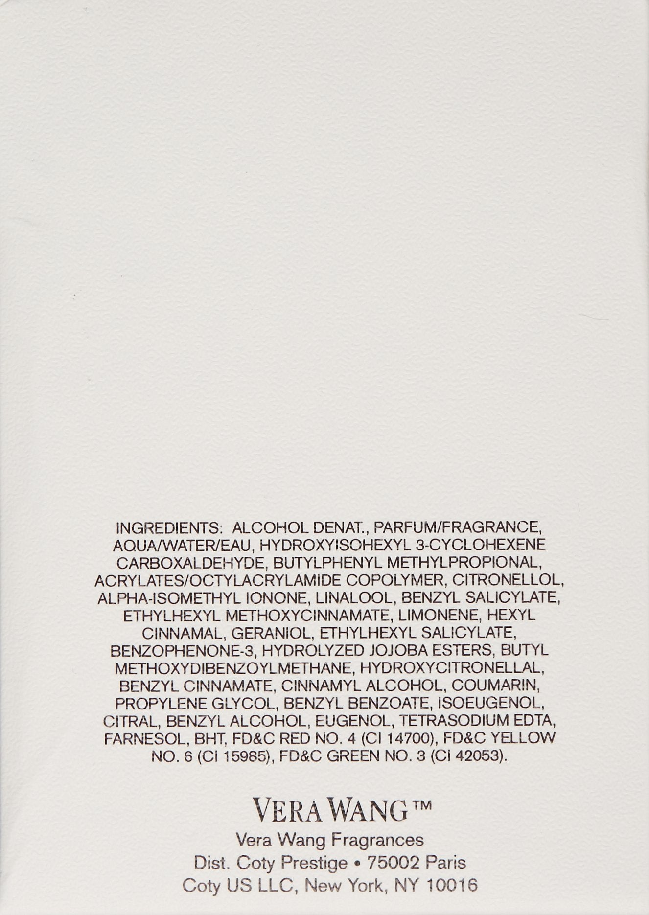 Introduced in 2002. Fragrance notes: mandarin, lotus and iris, exotic and feminine. Recommended use: romantic. When applying any fragrance please consider that there are several factors which can affect the natural smell of your skin and, in turn, the way a scent smells on you. For instance, your mood, stress level, age, body chemistry, diet, and current medications may all alter the scents you wear. Similarly, factor such as dry or oily skin can even affect the amount of time a fragrance will last after being applied. A subtle blend of floral scents, Vera Wang for women is a versatile fragrance and a suitable accessory for both casual and formal wear. Its secret lies in the ethereal, unobtrusive character of iris, lily and gardenia notes, a harmonious combination that suggests grace, femininity and taste. Slight hints of mandarin orange surface every now and then like a light breeze, while soft sandalwood tones linger long after application. Introduced in 2002 by Vera Wang, this eau de parfum spray underlines your presence with its light and elegant aroma.