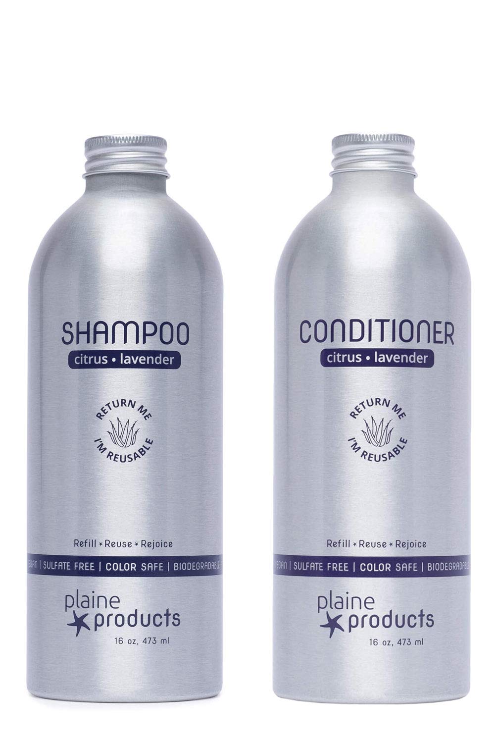 Feel good while you do good when you use our citrus lavender shampoo and conditioner in refillable, returnable aluminum bottles. Our organic ingredients work together to bring your hair back to life and restore manageability, adding sheen and softness. How our eco-friendly packaging system works: #1 - Order one of our awesome products. Take the lid off and insert the pump into the refillable bottle. #2 - Recycle the original shipping box and the extra lid. #3 - When your product runs low, order a refill and switch the pump over to the new bottle when it arrives. #4 - Return your empty bottles in the refill's box with the enclosed shipping label for FREE to be cleaned, refilled and reused. We make it easy to help the planet while treating yourself!