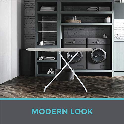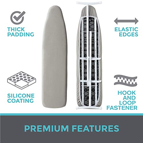 Details: SILICONE COATING Covers have an innovative silicone coating which reflects heat (and doesn’t absorb it like some others) to help make ironing more effective, so you can have perfect, wrinkle-free clothing in no time! THICK AND DURABLE Forget about scorched and burned ironing board covers that are an embarrassing eyesore, this cover is ultra thick and durable, made to resist scorching and staining, even after prolonged use. It’s heavy duty and designed to last a lifetime. STAYS IN PLACE Covers include not one but 2 hook and loop fasteners on the underside that help the cover stay in place. Plus, the cover has strong elasticized edges that prevent movement on the board. PERFECT FIT Wow! You’ve never had an ironing board cover fit this well! Measuring 15 by 54 inches, the cover makes it a perfect fit for all standard-sized ironing boards. Plus, the elasticized edges on the cover create a seamless, beautiful look on your board. Please note: ironing board not included with cover.