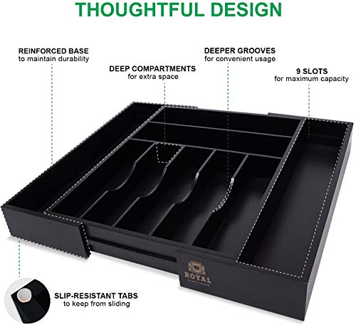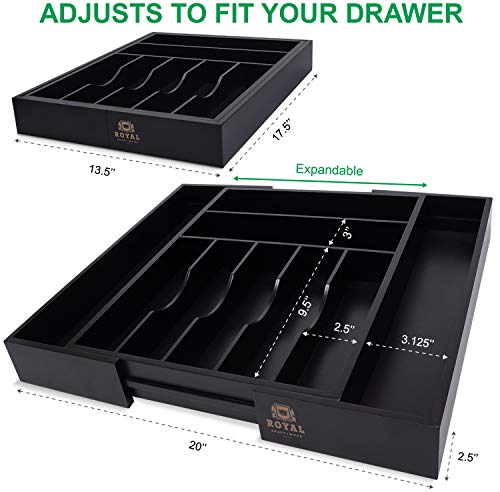 • Black utensil holder for the drawer. Royal Craft Wood bamboo expandable drawer organizer for utensils holder is perfect to keep everything in hand reach. Forget about the messy drawers now with a Royal Craft Wood. Organize your kitchen utensils, office stuff, or jewelry with a bamboo silverware drawer organizer.
